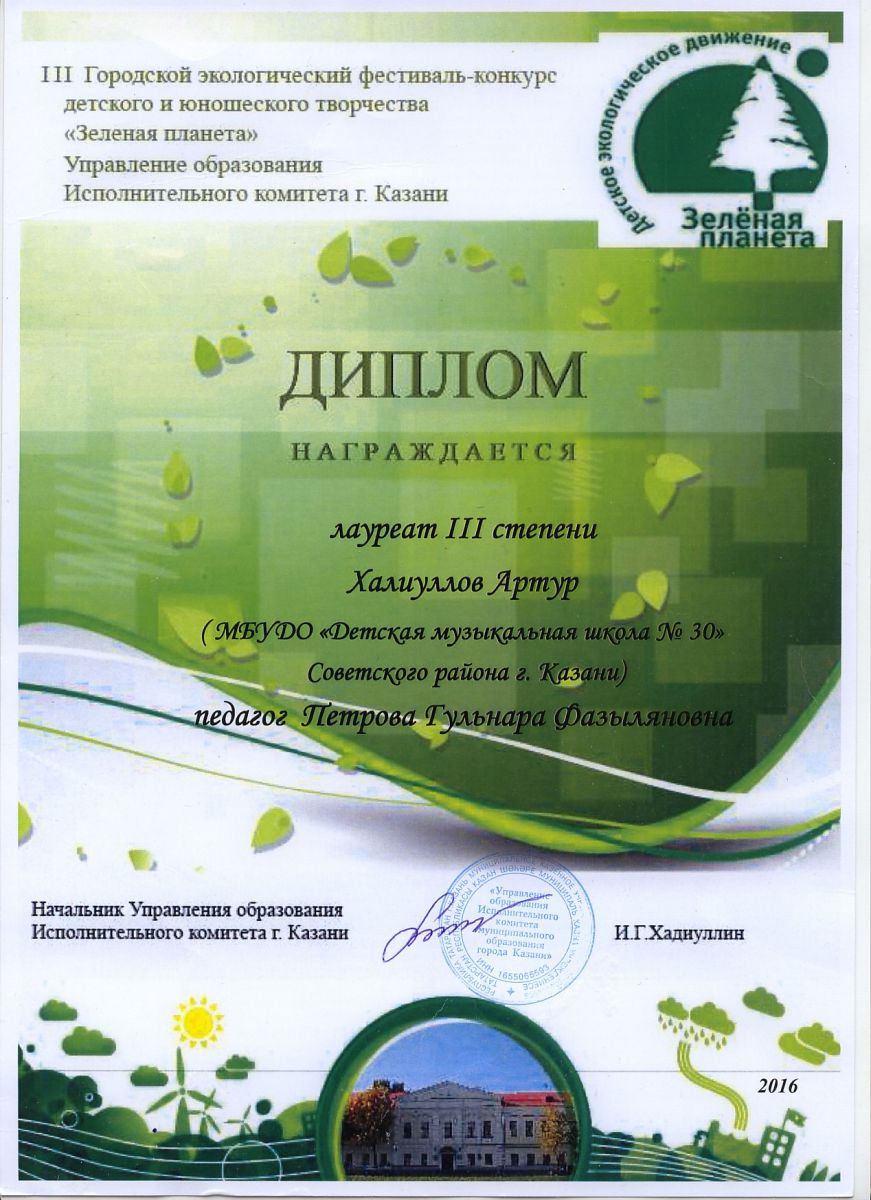 III Городской экологический фестиваль-конкурс детского и юношеского творчества "Зелёная планета" - Халиуллов Артур - III место