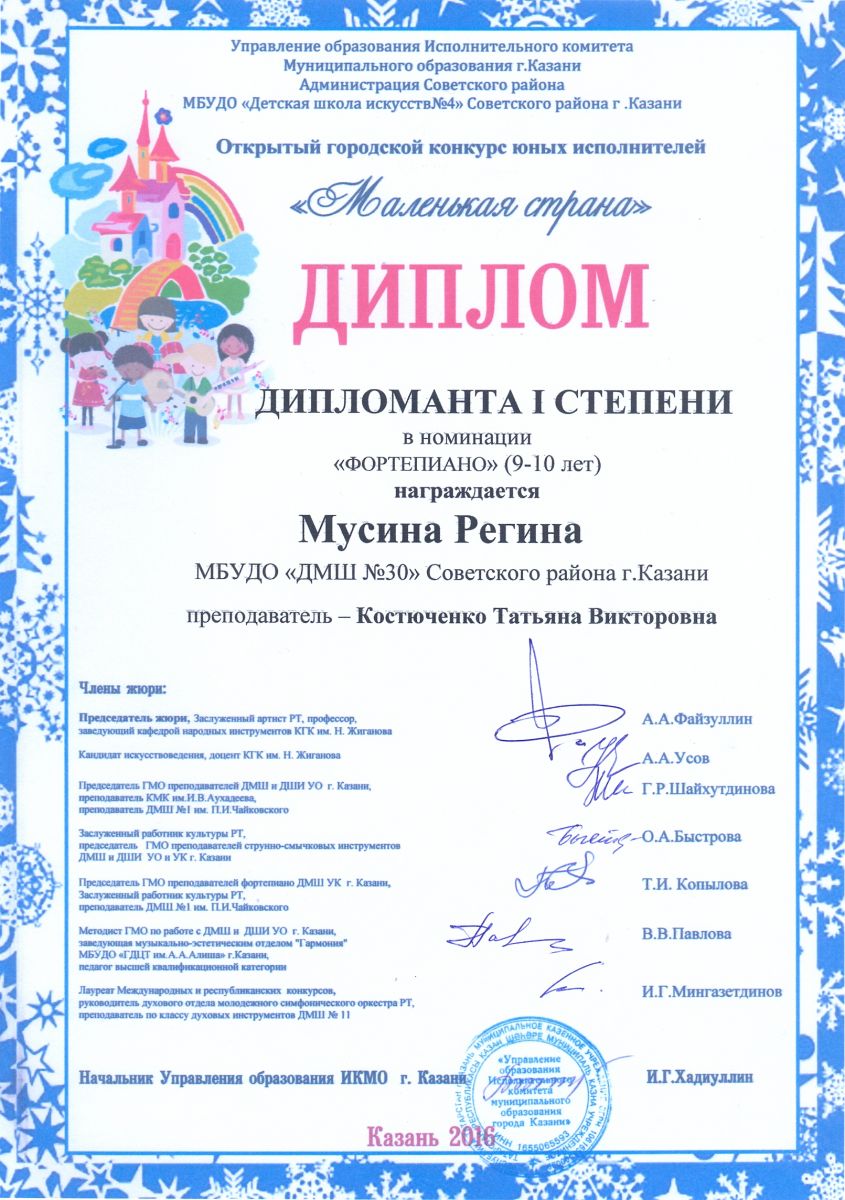 Открытый городской конкурс юных исполнителей "Маленькая страна" - Мусина Регина - диплом I степени