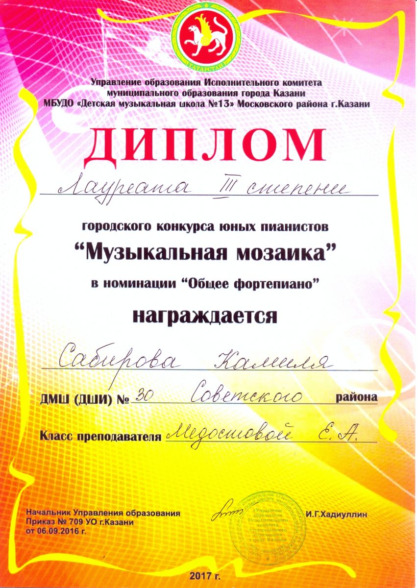 Городской конкурс юных пианистов "Музыкальная мозаика" - Сабирова Камиля -III место (номинация "общее фортепиано")