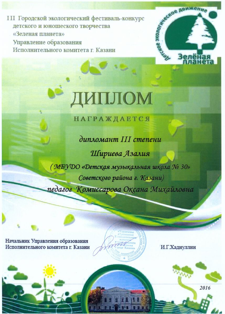 III Городской экологический фестиваль-конкурс детского и юношеского творчества "Зелёная планета" - Шириева Азалия - диплом III степени