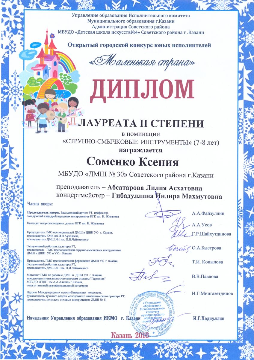 Городской фестиваль секции струнно-смычковых инструментов г.Казани, посвященного Году экологии "Мы дети твои, Земля" - Соменко Ксения - диплом участника