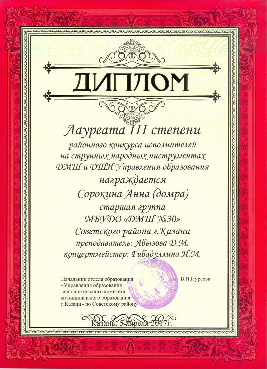 Районный конкурс исполнителей на струнных народных инструментах ДМШ и ДШИ Управления образования - Сорокина Анна - III место