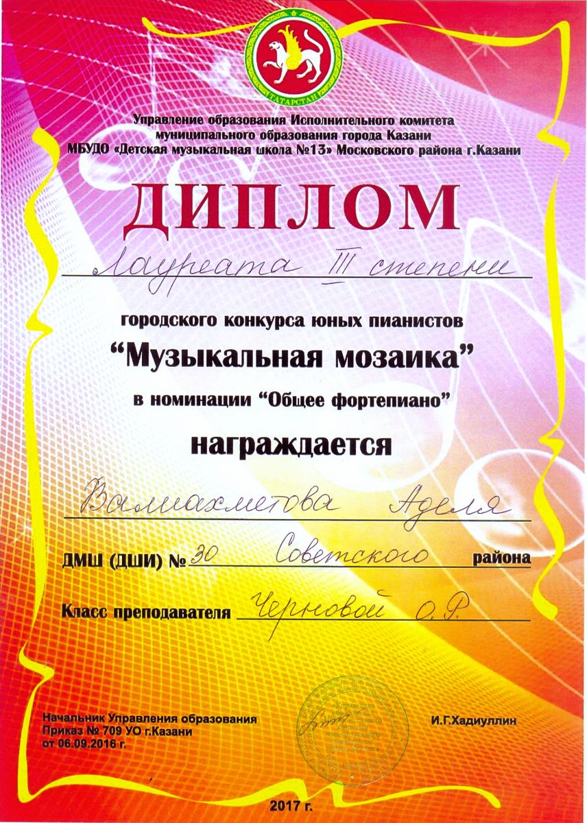 Городской конкурс юных пианистов "Музыкальная мозаика" - Валиахметова Аделя -III место (номинация "общее фортепиано")