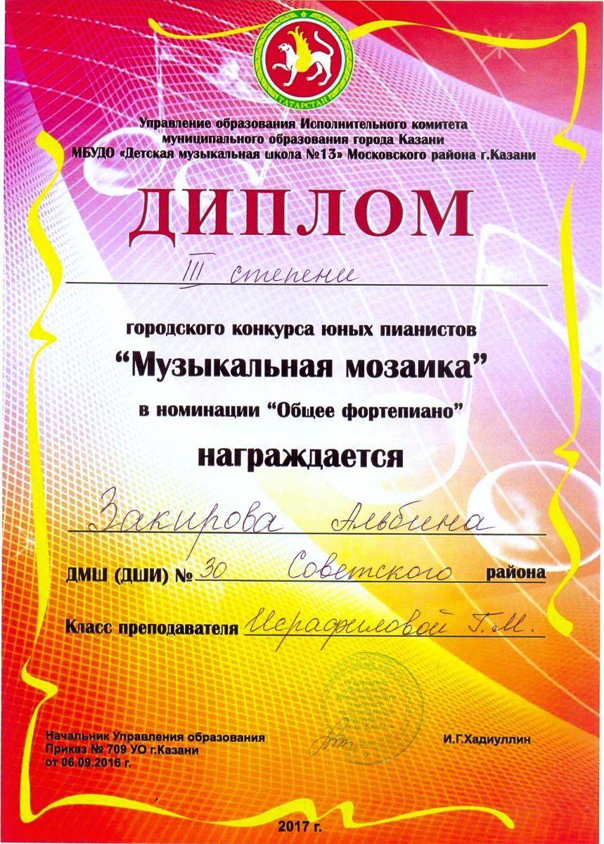 Городской конкурс юных пианистов "Музыкальная мозаика" - Закирова Альбина - диплом III степени (номинация "общее фортепиано")