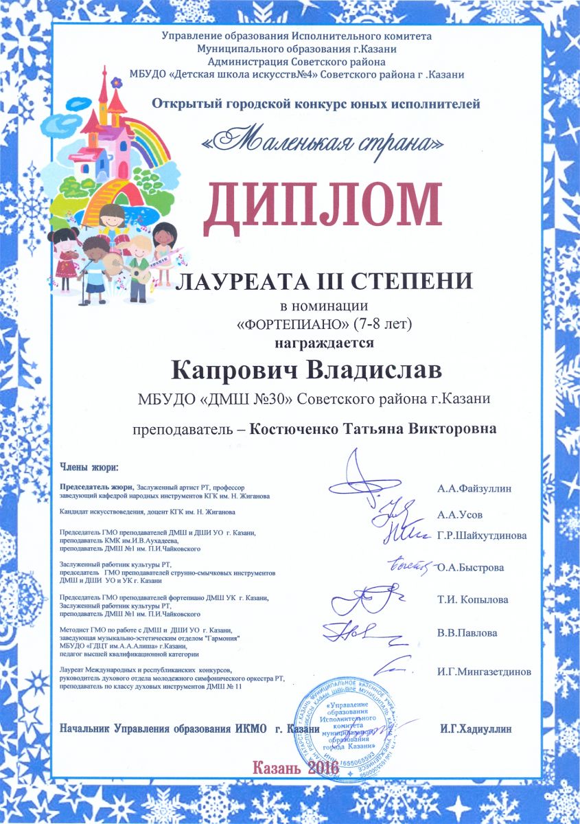 Открытый городской конкурс юных исполнителей "Маленькая страна" - Капрович Владислав - III место