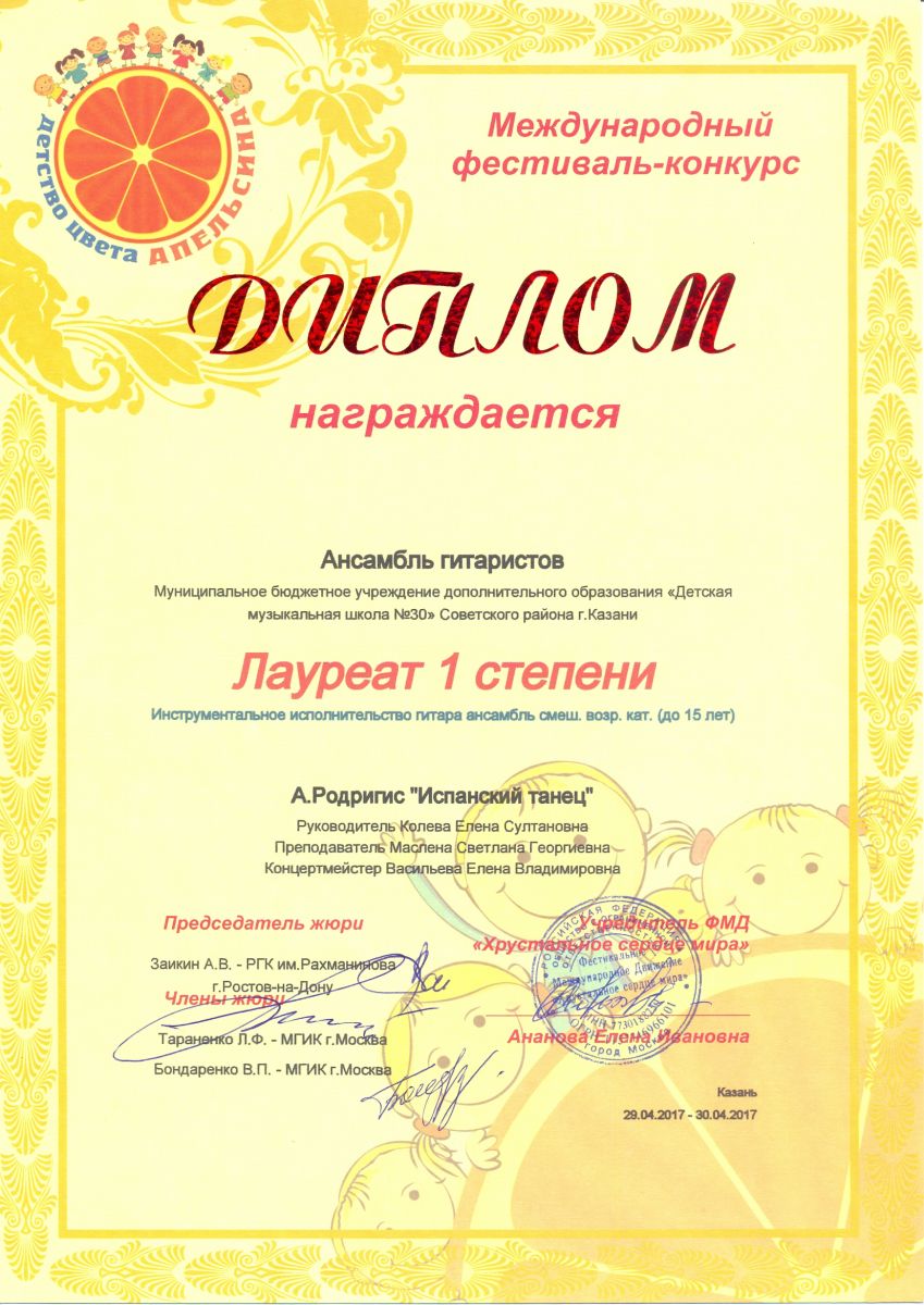 Международный фестиваль-конкурс "Детство цвета апельсина" - ансамбль гитаристов - I место