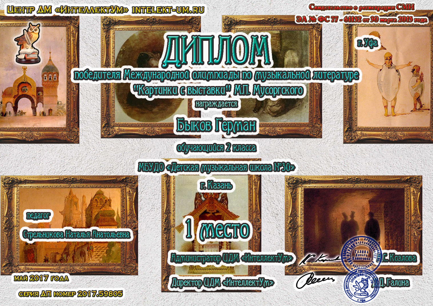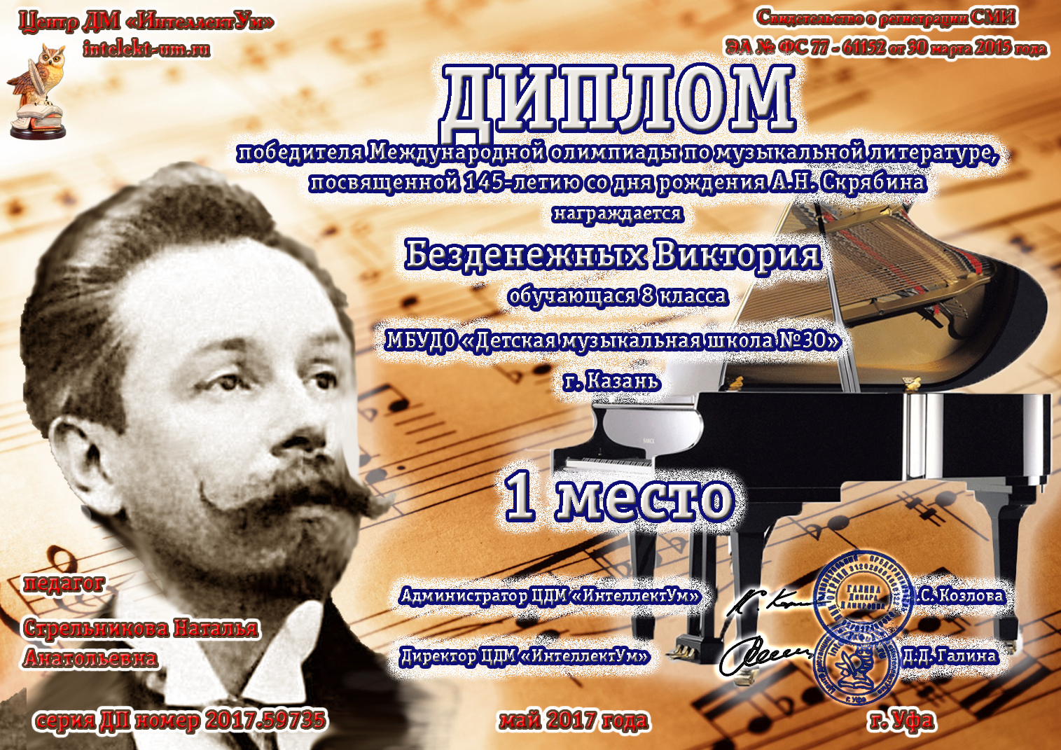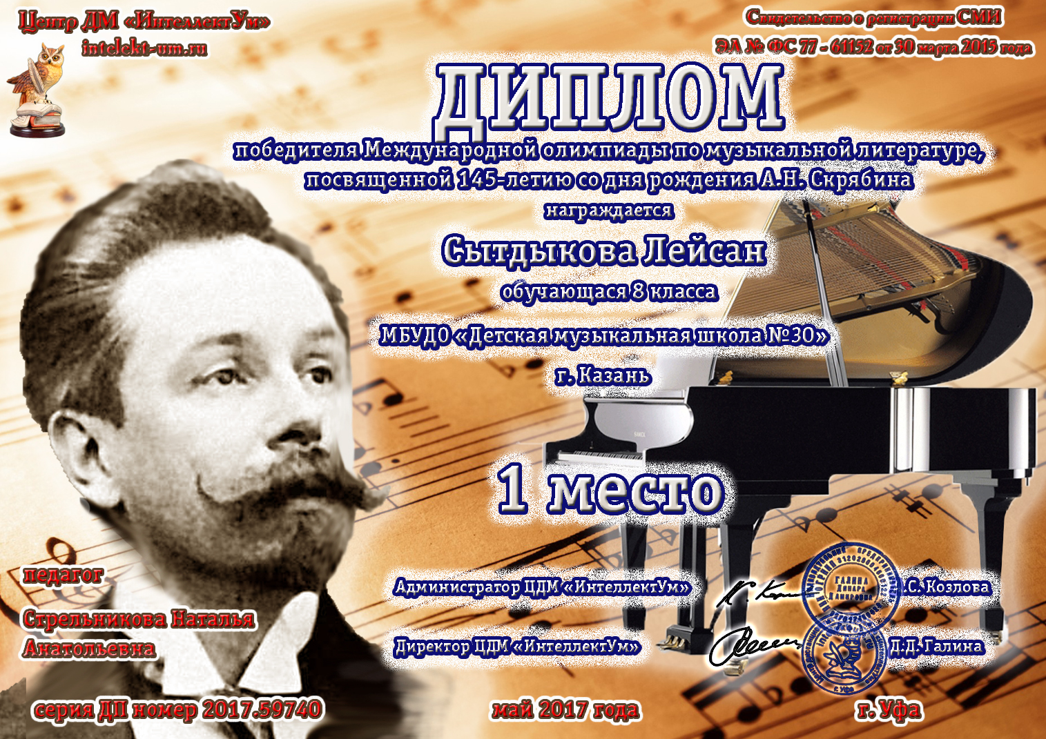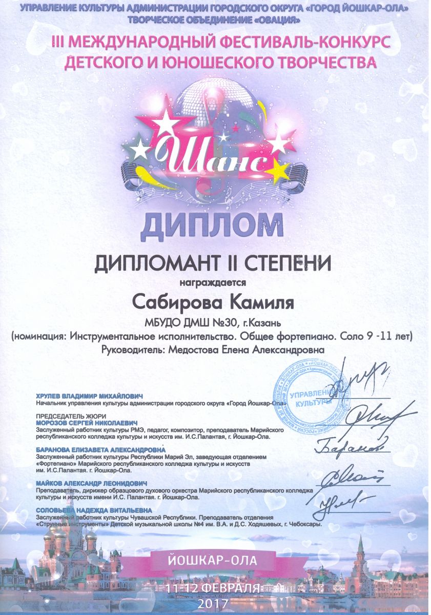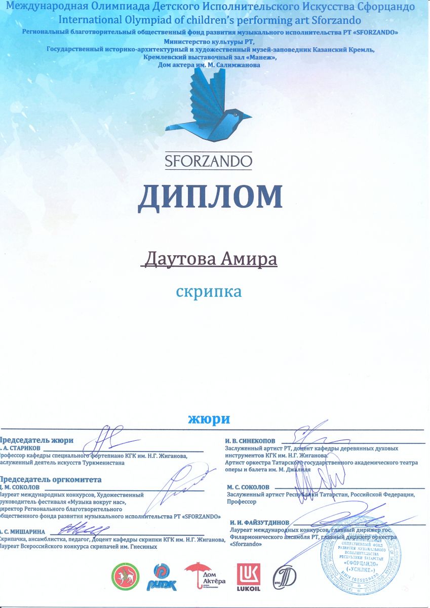 Международная олимпиада детского исполнительского искусства "SFORZANDO" Даутова Амира - диплом