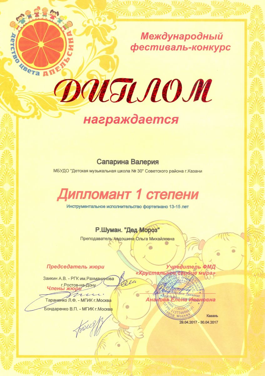 Международный фестиваль-конкурс "Детство цвета апельсина" - Сапарина Валерия - диплом I степени