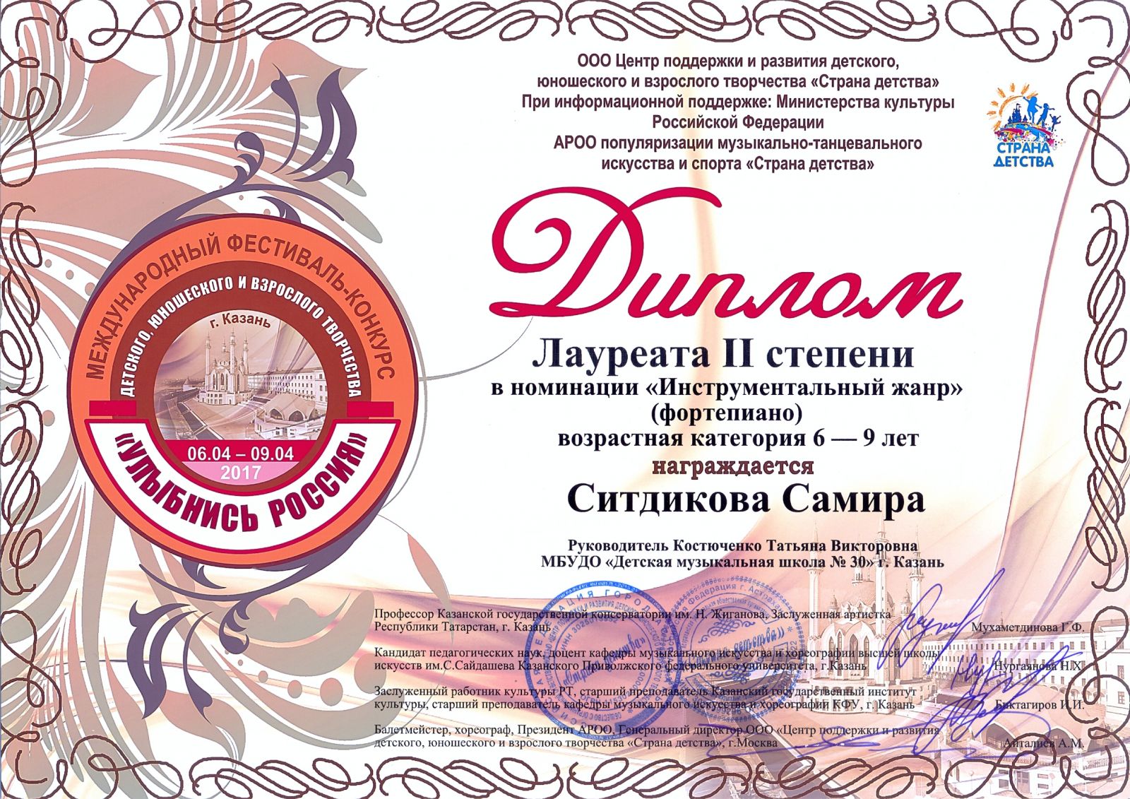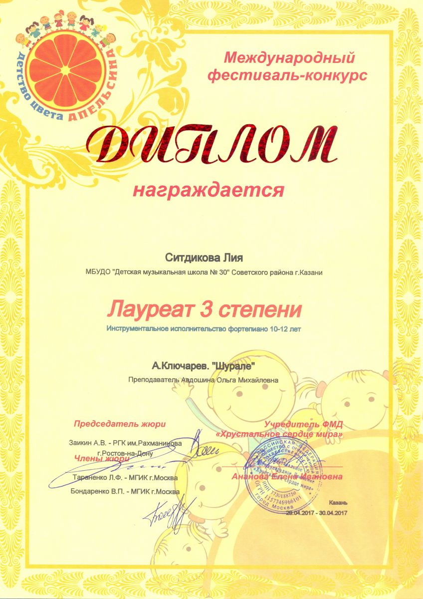 Международный фестиваль-конкурс "Детство цвета апельсина" - Ситдикова Лия - III место