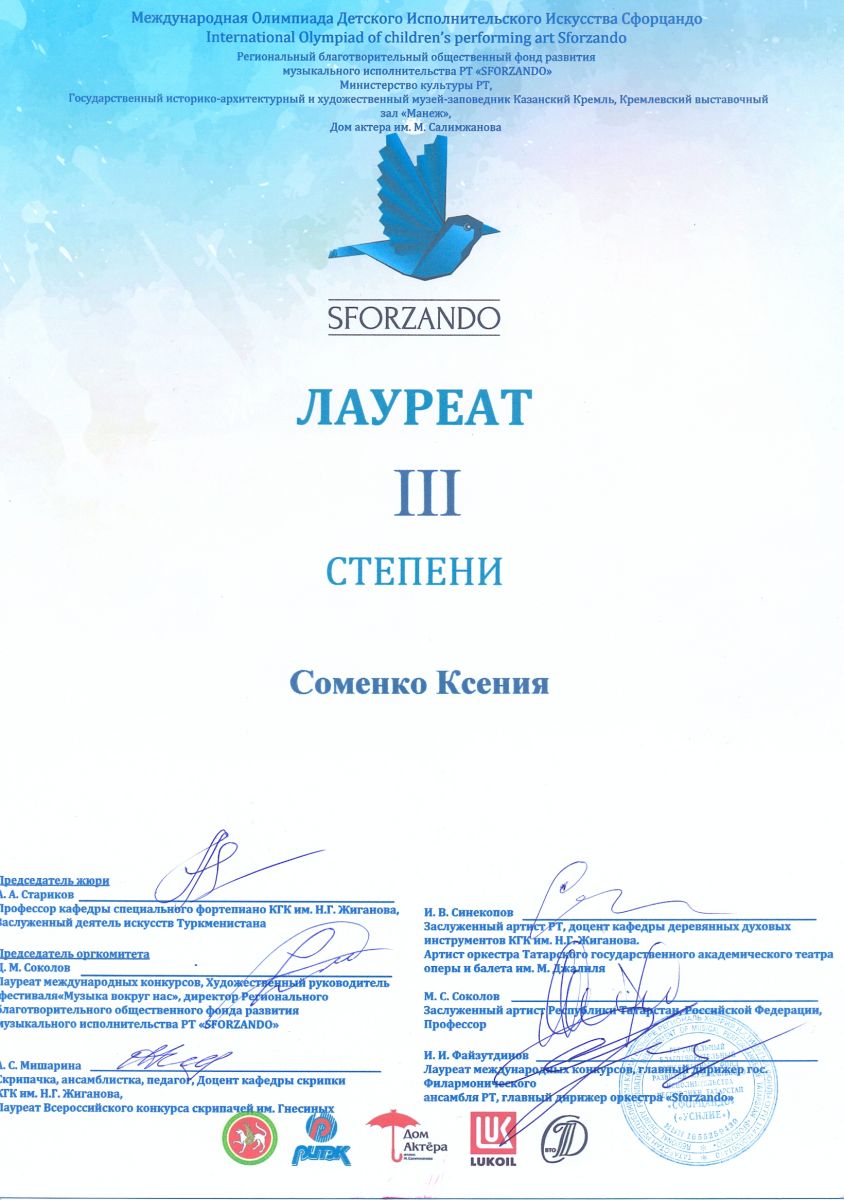 Международная олимпиада детского исполнительского искусства "SFORZANDO" - Соменко Ксения - III место