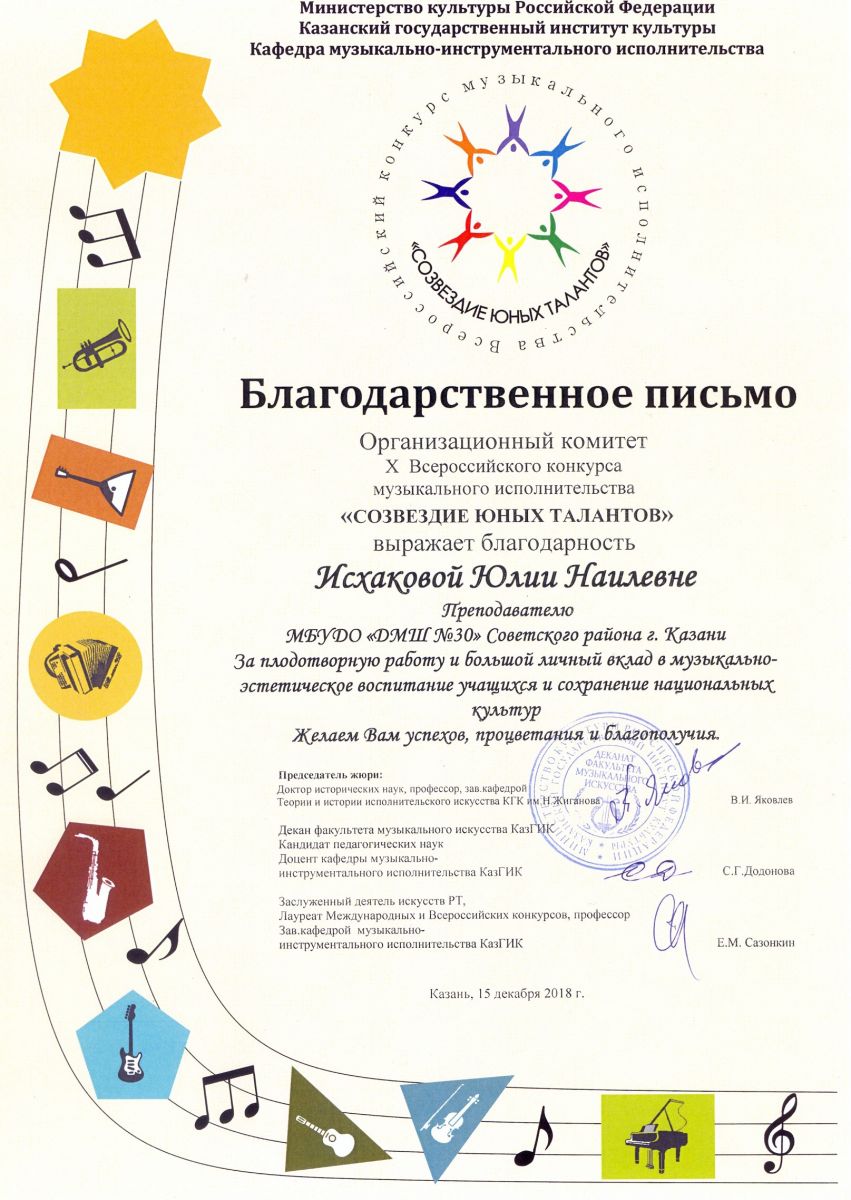 Международный конкурс-фестиваль "На крыльях таланта" - Исхакова Ю.Н. - благодарность