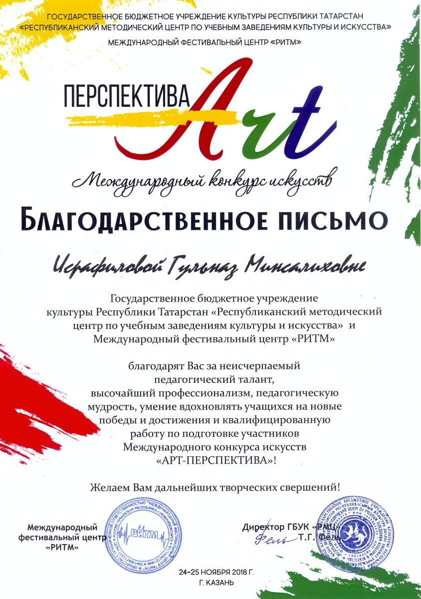 Международный конкурс искусств "Art перспектива" - Исрафилова Г.М. - Благодарственное письмо