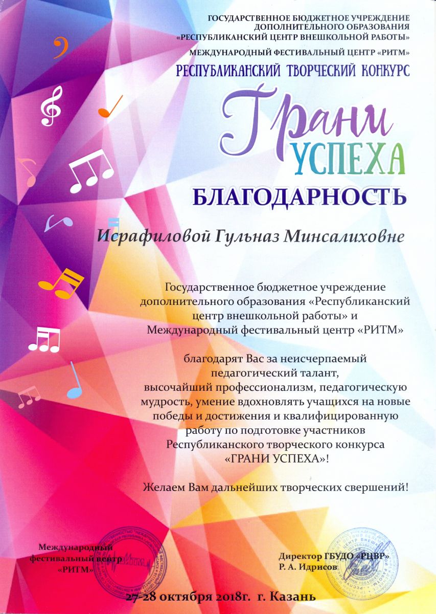 Республиканский творческий конкурс "Грани успеха" - Исрафилова Г.М. - Благодарственное письмо