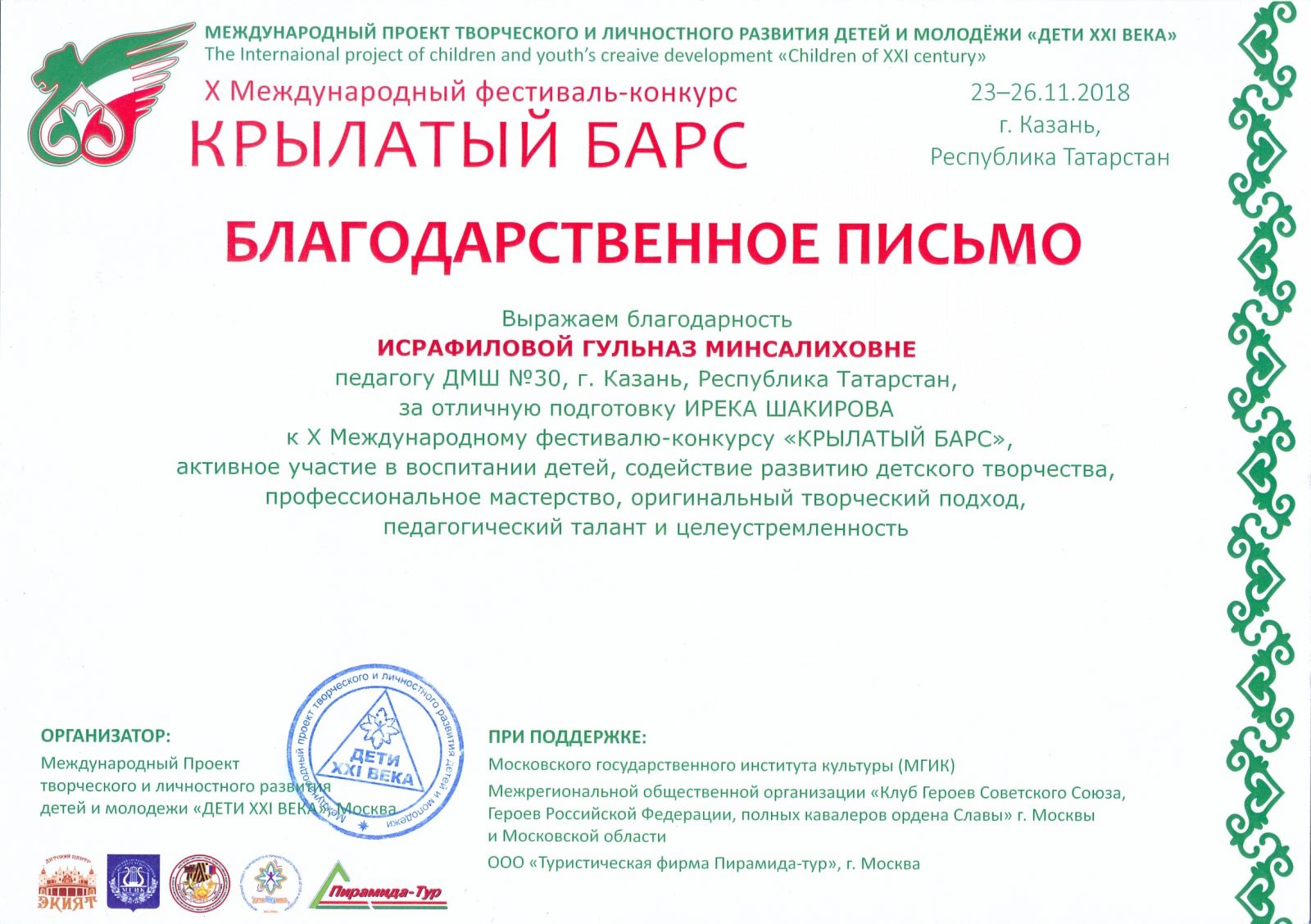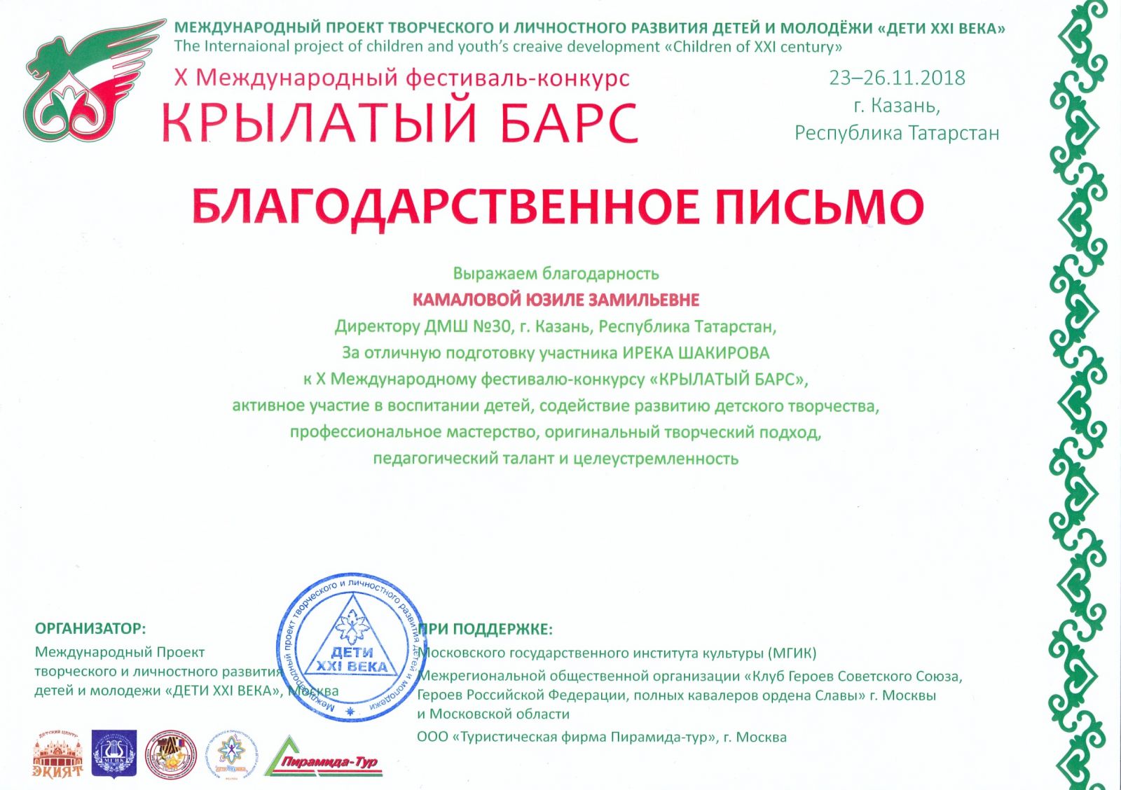 X Международный фестиваль-конкурс "Крылатый барс" - Камалова Ю.З. - Благодарственное письмо
