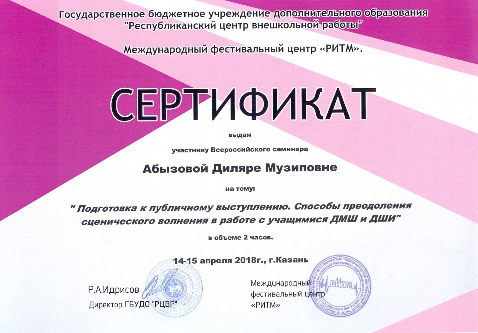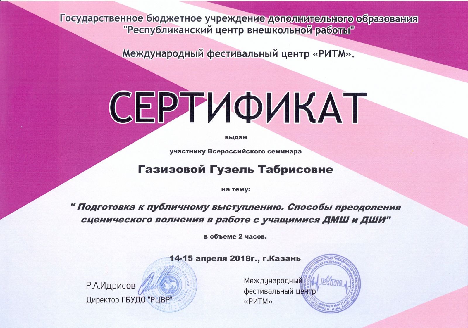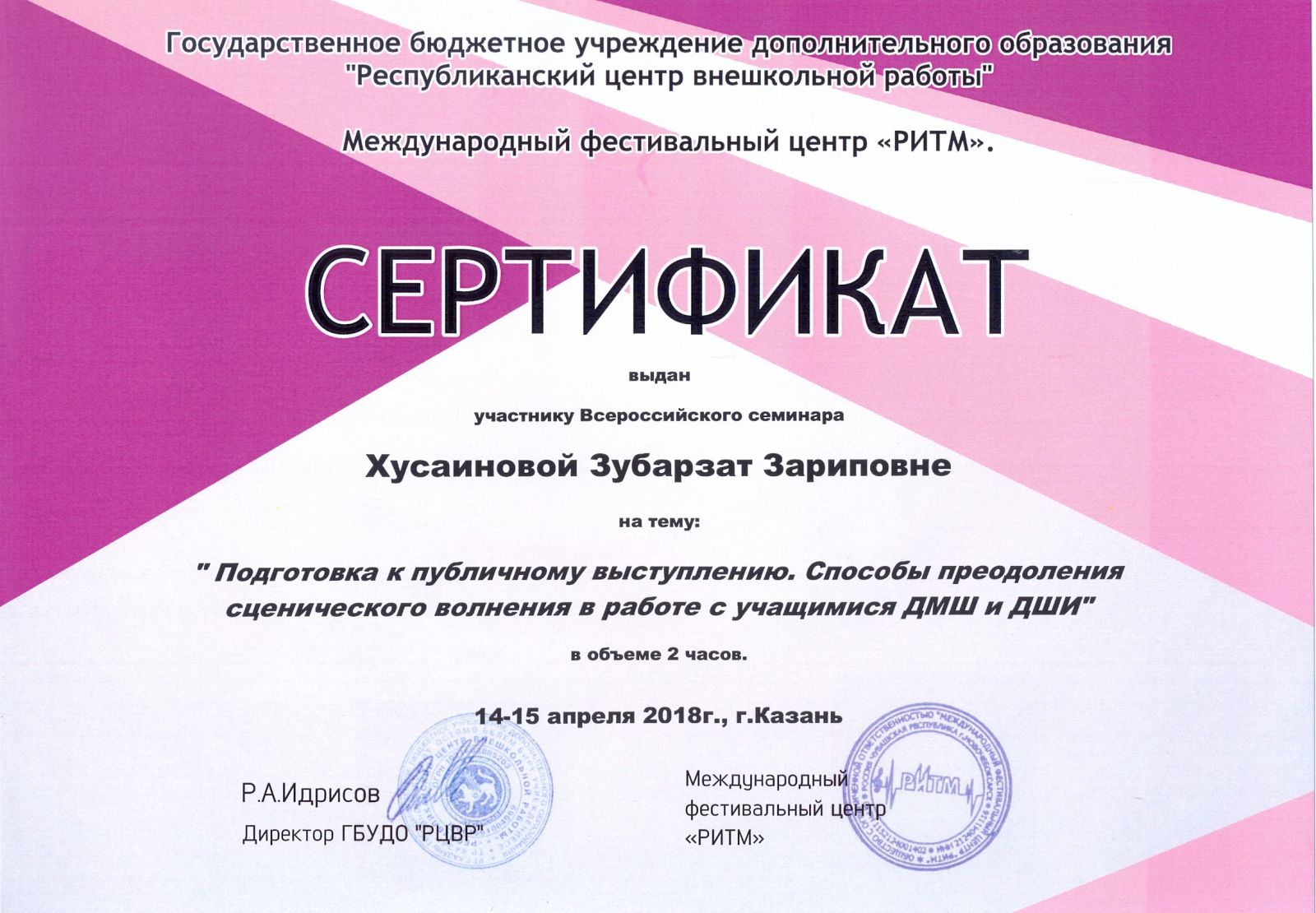 Всероссийский семинар в рамках фестиваля-конкурса "Ритмы весны" на тему "Подготовка к публичному выступлению. Способы преодоления сценического волнения в работе с учащимися ДМШ и ДШИ" - Хусаинова З.З. - сертификат участника