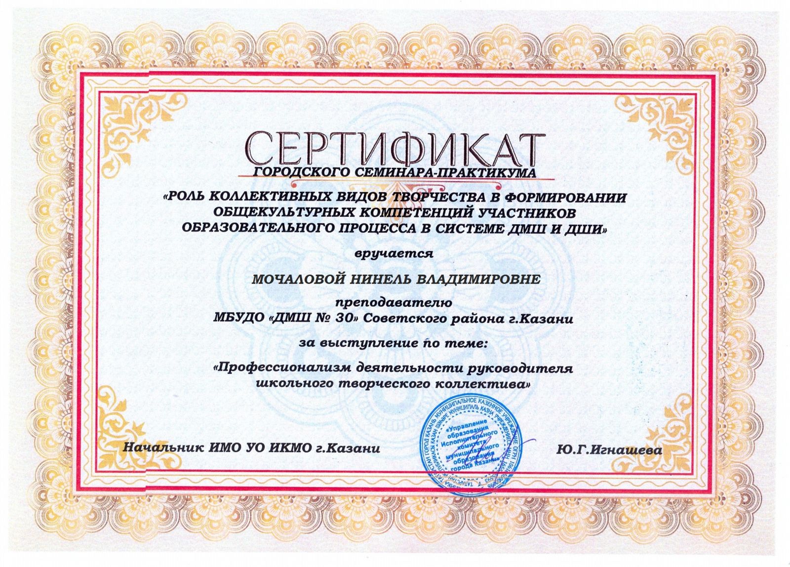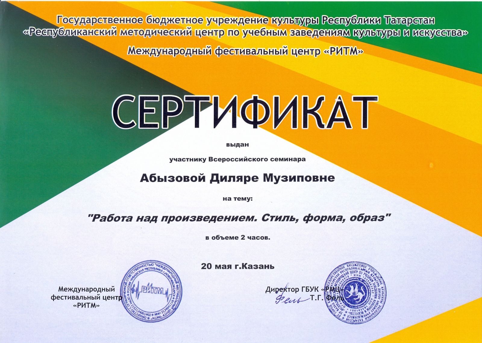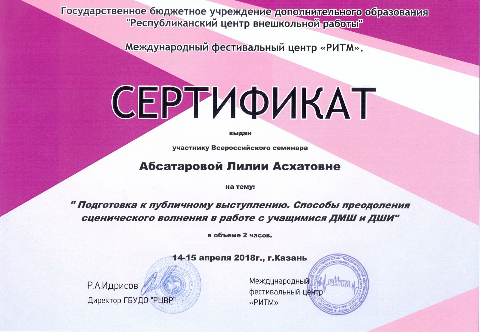 Всероссийский семинар в рамках фестиваля-конкурса "Ритмы весны" на тему "Подготовка к публичному выступлению. Способы преодоления сценического волнения в работе с учащимися ДМШ и ДШИ" - Хусаинова З.З. - сертификат участника