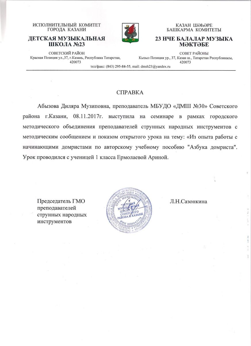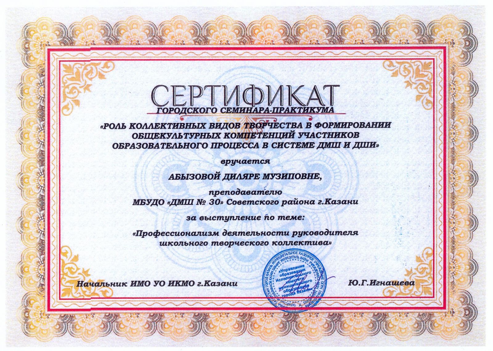 Городской семинар-практикум руководящих и педагогических работников учреждений дополнительного образования г.Казани "Роль коллективных видов творчества в формировании общекультурных компетенций участников образовательного процесса в системе ДМШ и ДШИ" - выступление Абызовой Д.М. по теме "Профессионализм деятельности руководителя школьного творческого коллектива"