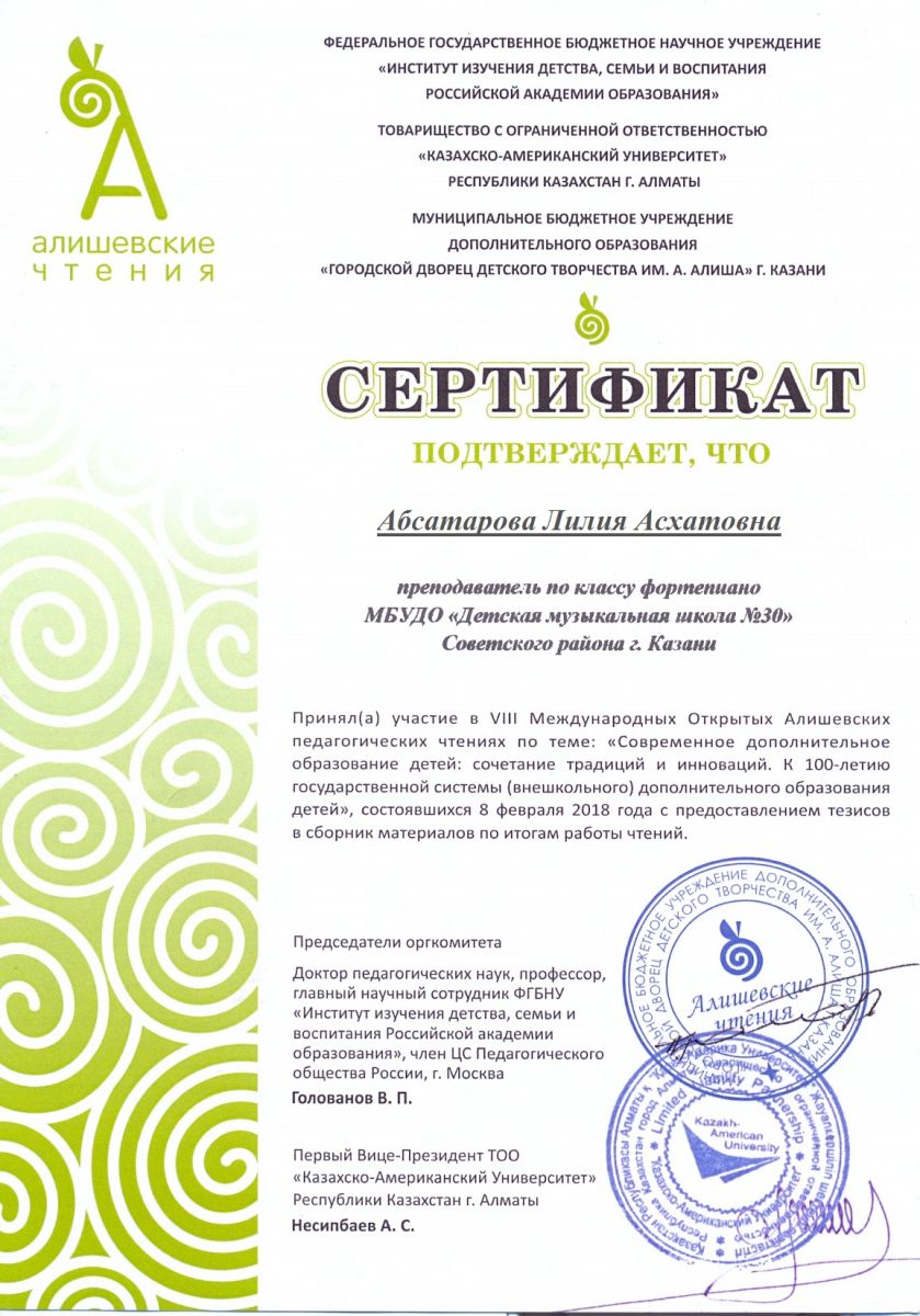 VIII Международные Открытые Алишевские педагогические чтения "Современное дополнительное образование детей: сочетание традиций и инноваций" - Абсатарова Л.А. (с публикацией тезисов выступления)