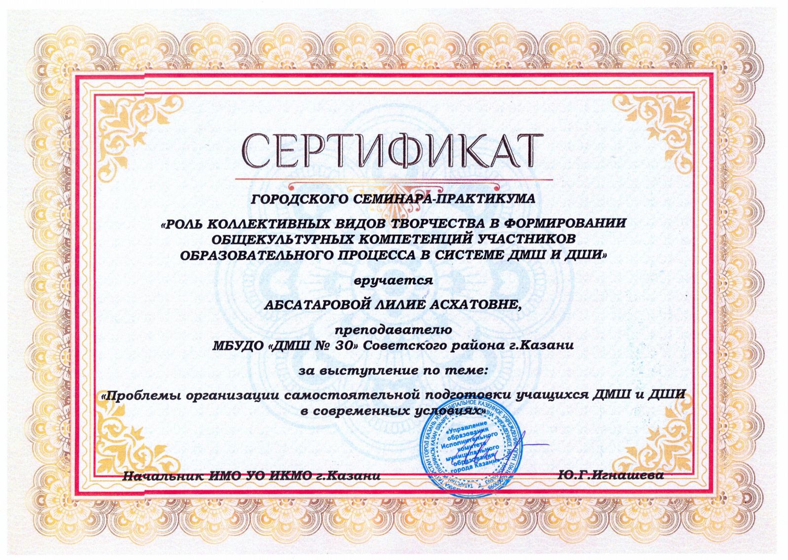 Городской семинар-практикум руководящих и педагогических работников учреждений дополнительного образования г.Казани "Роль коллективных видов творчества в фрмировании общекультурных компетенций участиников образовательного процесса в системе ДМШ и ДШИ" - выступление Абсатаровой Л.А. по теме "Проблемы организации самостоятельной подготовки учащихся ДМШ и ДШИ в современных условиях"