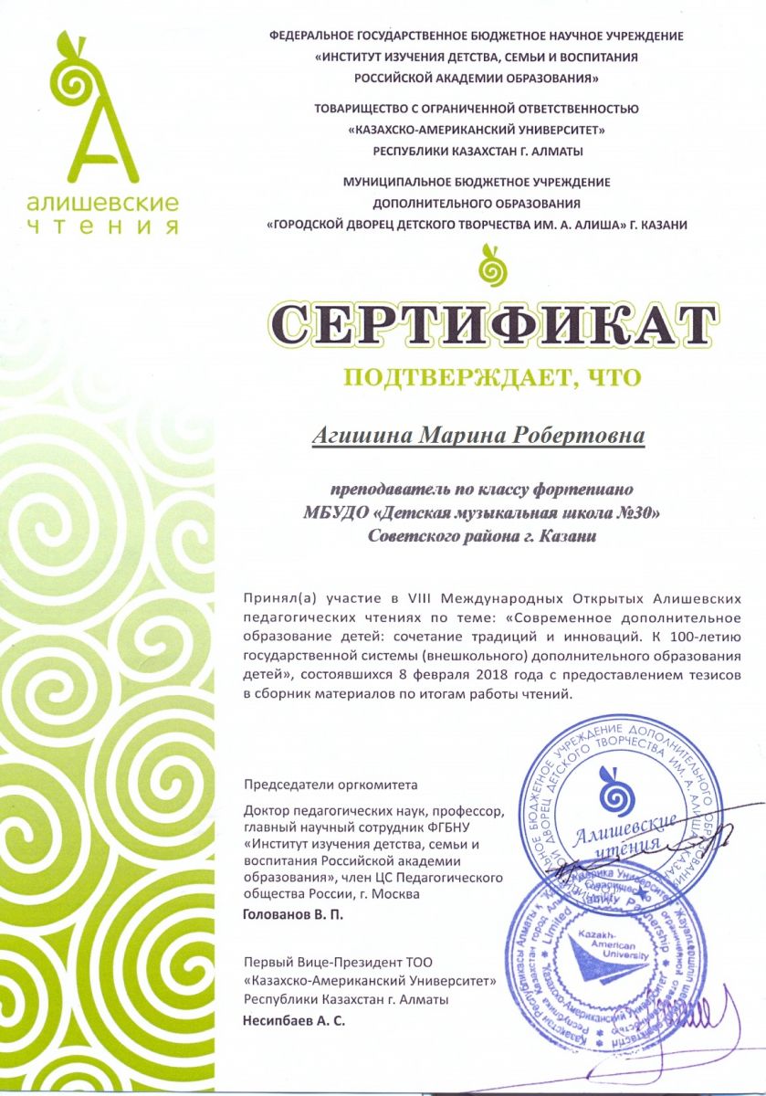 VIII Международные Открытые Алишевские педагогические чтения "Современное дополнительное образование детей: сочетание традиций и инноваций" - Агишина М.Р. (с публикацией тезисов выступления)