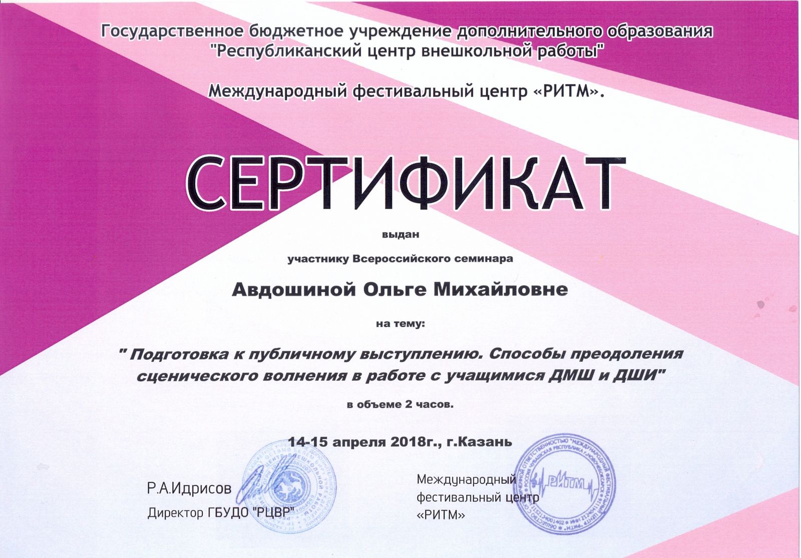 Всероссийский семинар в рамках фестиваля-конкурса "Ритмы весны" на тему "Подготовка к публичному выступлению. Способы преодоления сценического волнения в работе с учащимися ДМШ и ДШИ" - Авдошина О.М. - сертификат участника