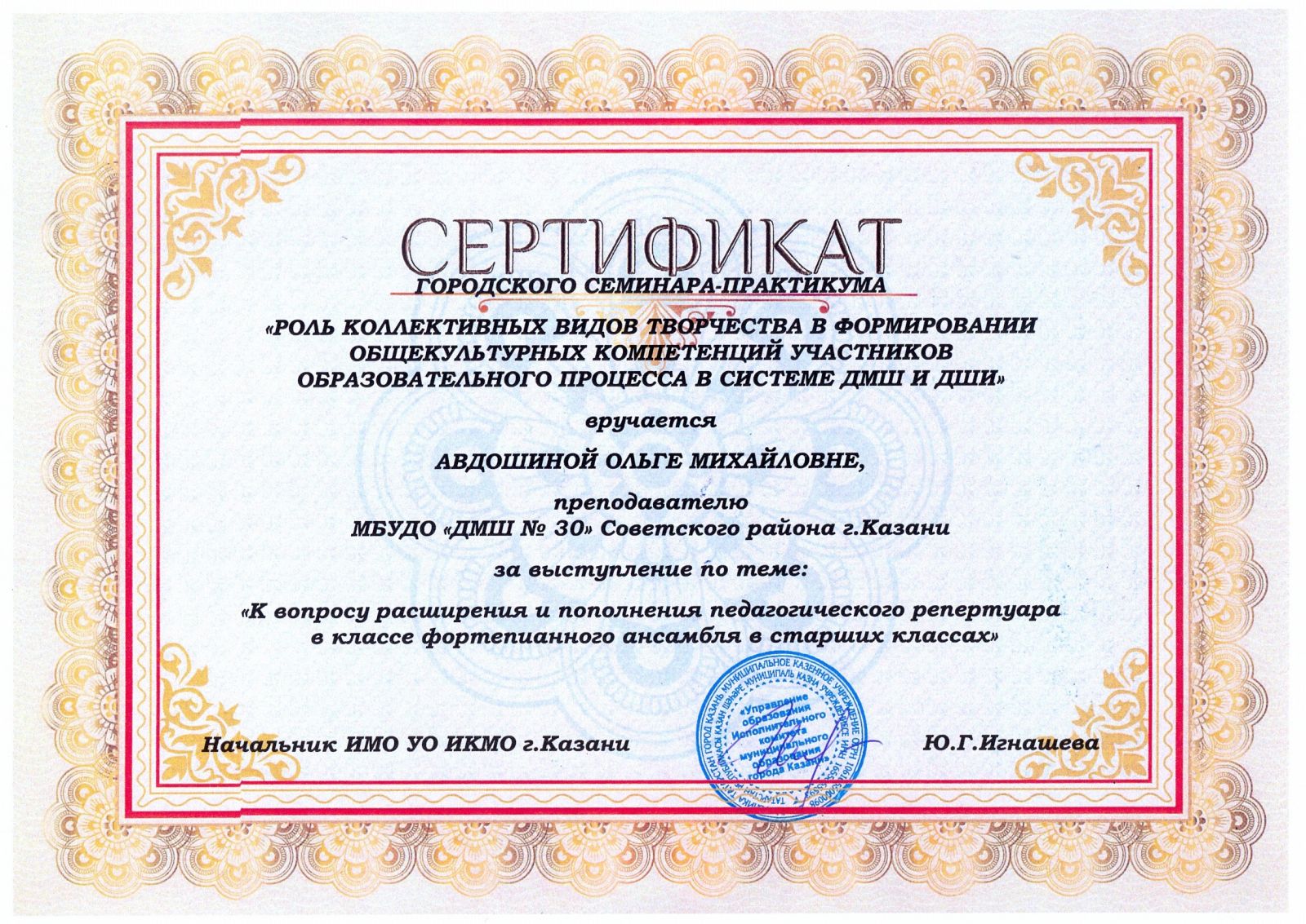 Городской семинар-практикум руководящих и педагогических работников учреждений дополнительного образования г.Казани "Роль коллективных видов творчества в фрмировании общекультурных компетенций участиников образовательного процесса в системе ДМШ и ДШИ" - выступление Авдошиной О.М. по теме "К вопросу расширения и пополнения педагогического репертуара в классе фортепианного ансамбля в старших класса"