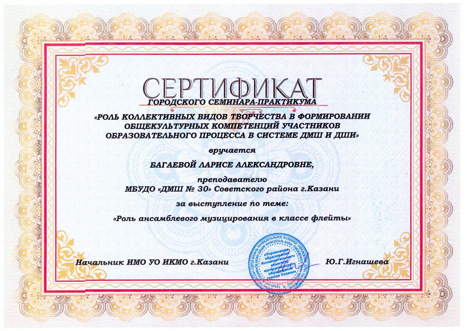 Городской семинар-практикум руководящих и педагогических работников учреждений дополнительного образования г.Казани "Роль коллективных видов творчества в фрмировании общекультурных компетенций участиников образовательного процесса в системе ДМШ и ДШИ" - выступление Багаевой Л.А. по теме "Роль ансамблевого музицирования в классе флейты в ДМШ"