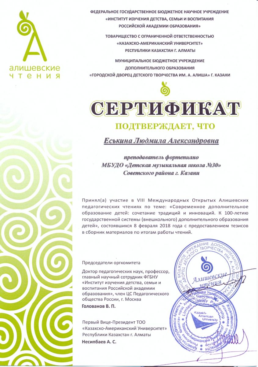 VIII Международные Открытые Алишевские педагогические чтения "Современное дополнительное образование детей: сочетание традиций и инноваций" - Еськина Л.А. (с публикацией тезисов выступления)