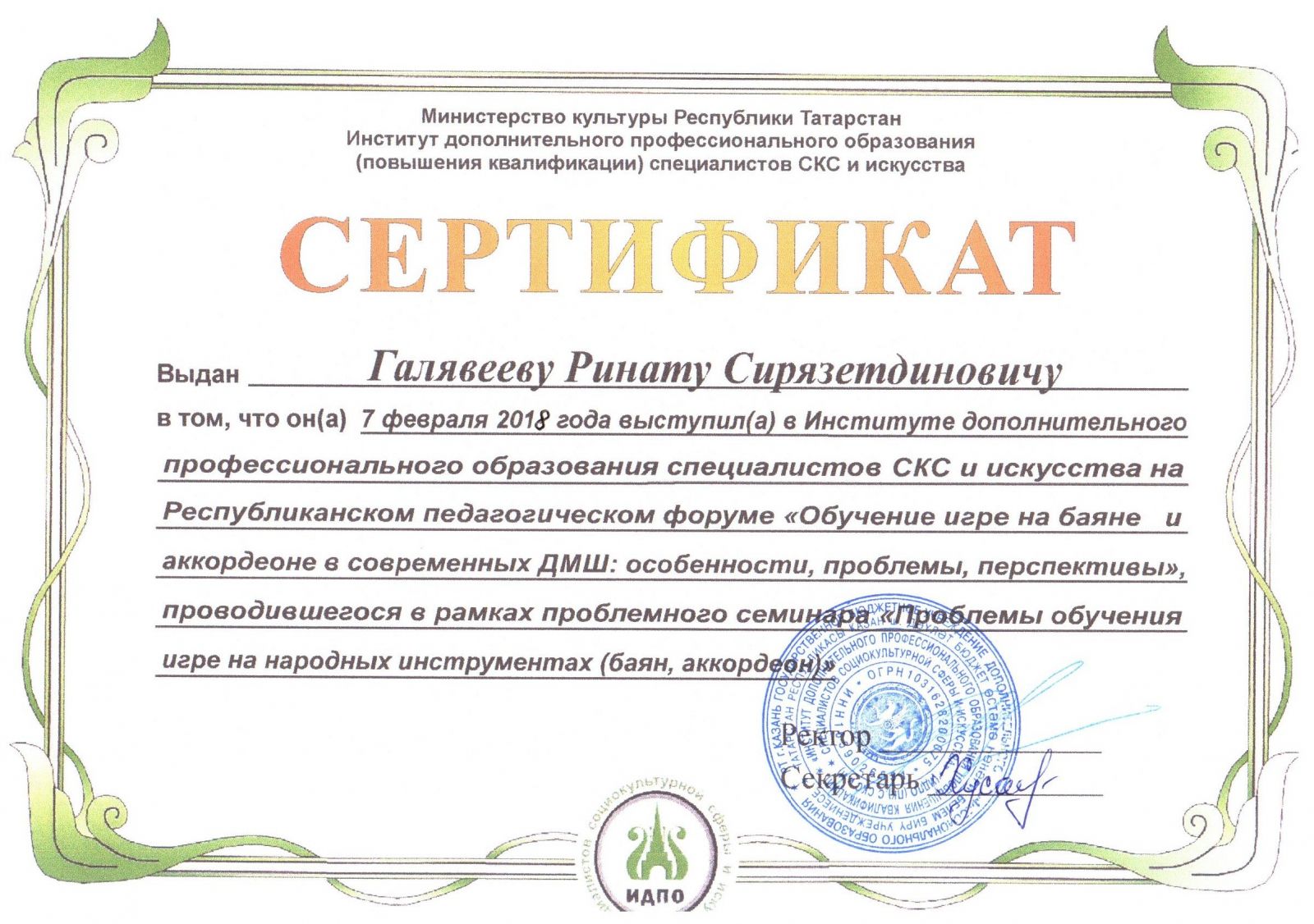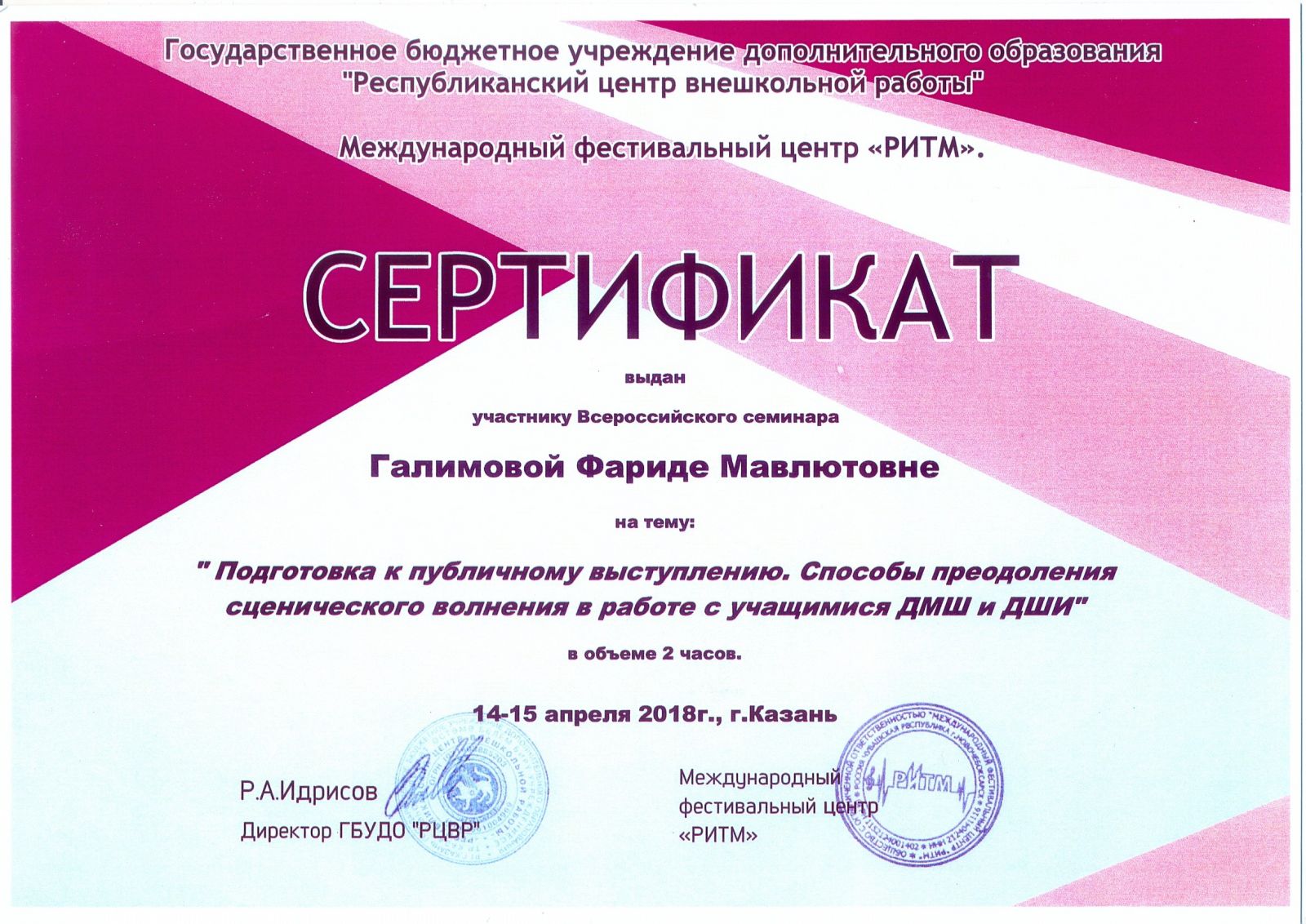 Всероссийский семинар в рамках фестиваля-конкурса "Ритмы весны" на тему "Подготовка к публичному выступлению. Способы преодоления сценического волнения в работе с учащимися ДМШ и ДШИ" - Галимова Ф.М. - сертификат участника