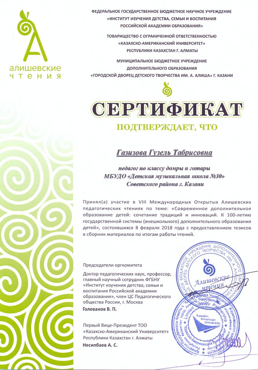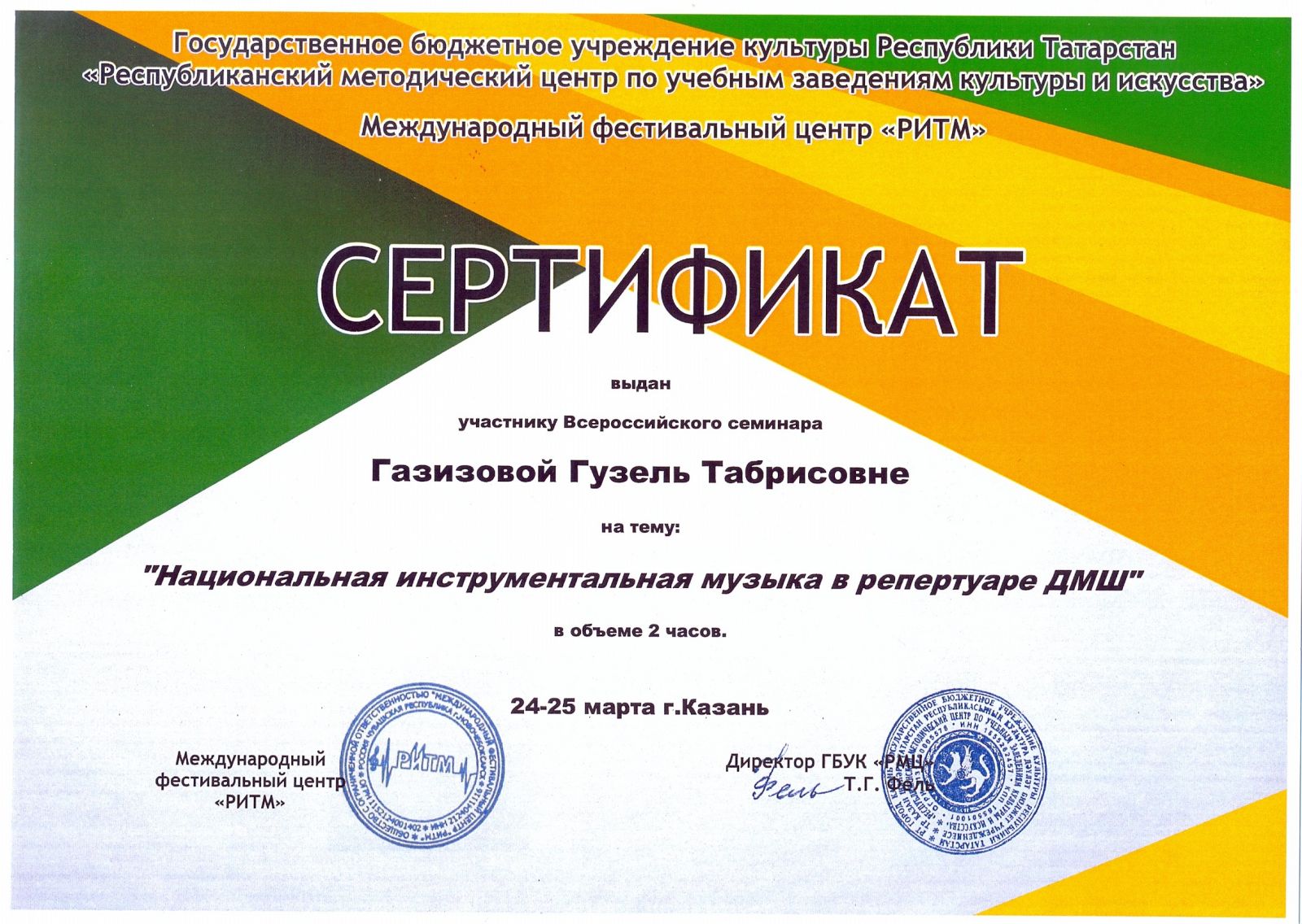Всероссийский семинар "Национальная инструментальная музыка в репертуаре ДМШ" в рамках проведения международных фестивалей "Ритм" - Газизова Г.Т. - сертификат участника