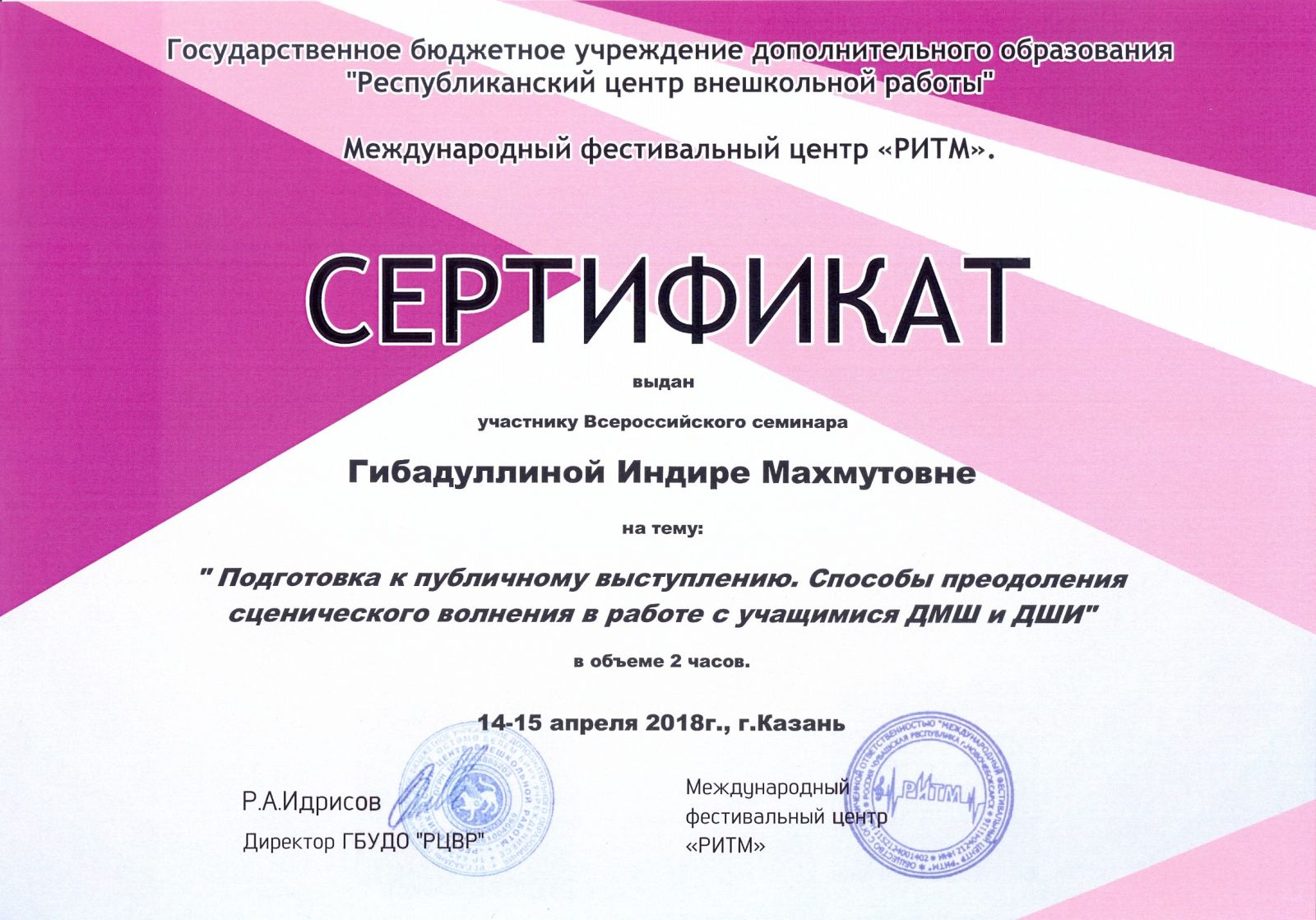 Всероссийский семинар в рамках фестиваля-конкурса "Ритмы весны" на тему "Подготовка к публичному выступлению. Способы преодоления сценического волнения в работе с учащимися ДМШ и ДШИ" - Гибадуллина И.М.- сертификат участника