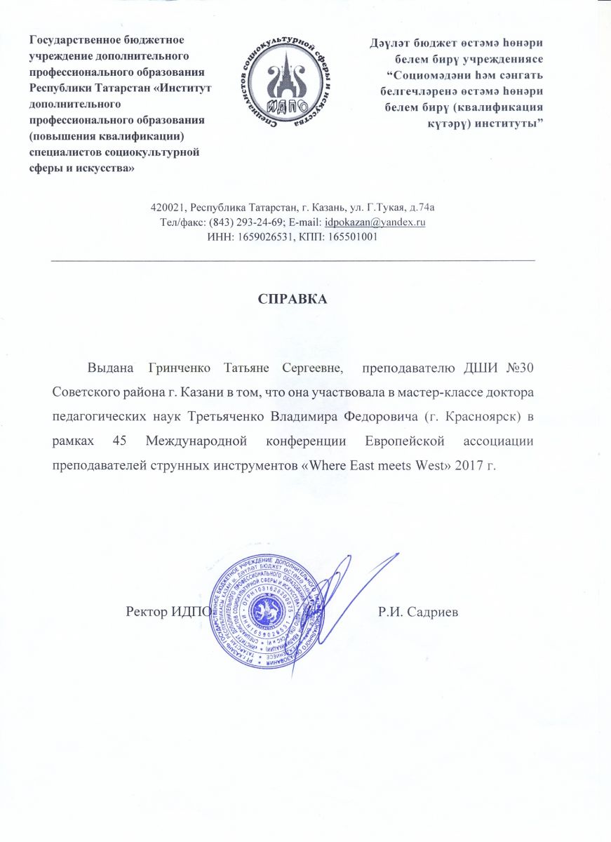 Мастер-классы Заслуженного работника культуры РТ, ведущего педагога КМК Л.С.Левицкой в КГК им.Н.Жиганова в рамках курсов повышения квалификации ИДПО МК РТ - Гринченко Т.С. - участник