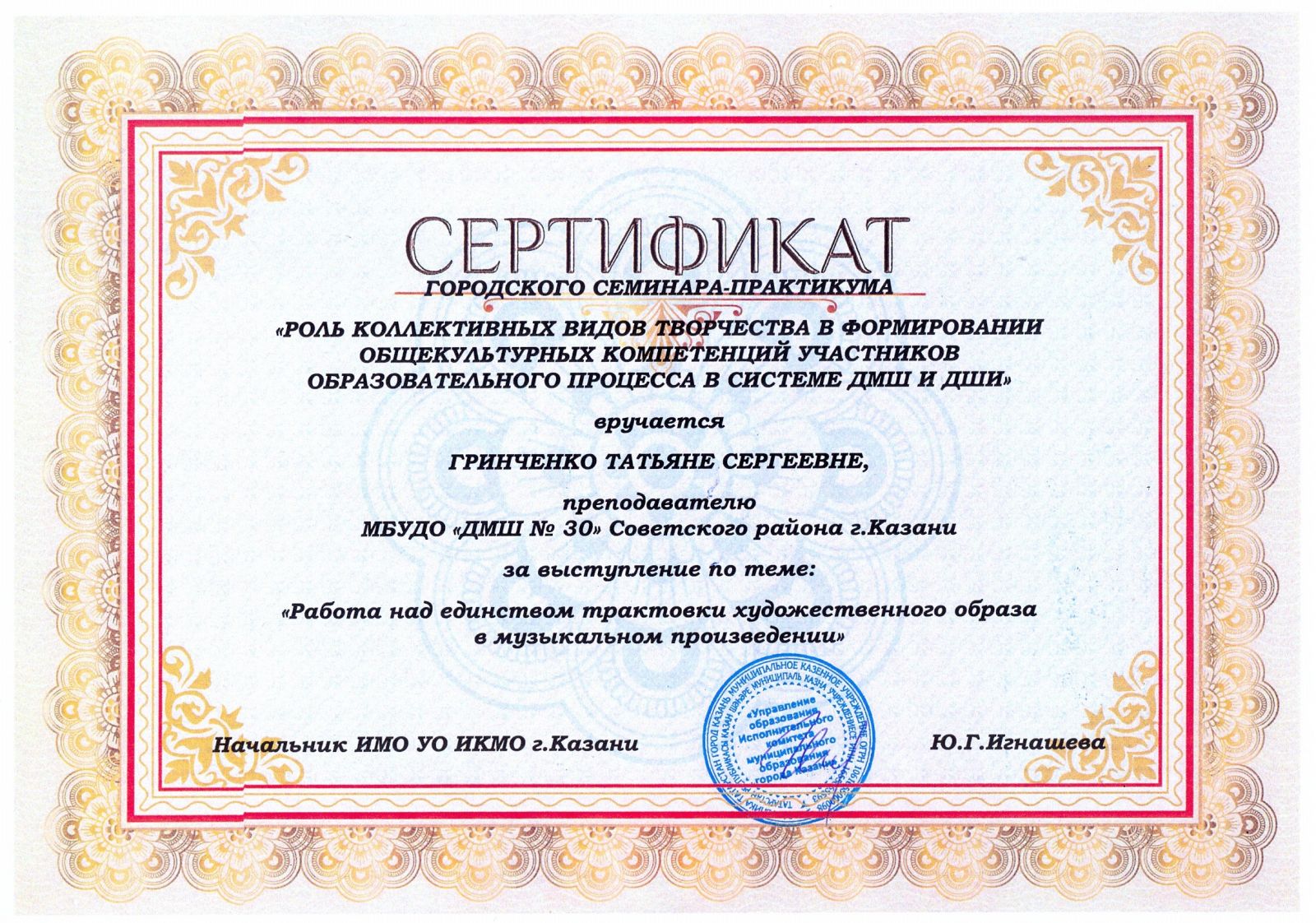Городской семинар-практикум руководящих и педагогических работников учреждений дополнительного образования г.Казани "Роль коллективных видов творчества в фрмировании общекультурных компетенций участиников образовательного процесса в системе ДМШ и ДШИ" - выступление Гринченко Т.С. по теме "Работа над единством трактовки художественного образа в музыкальном произведении"