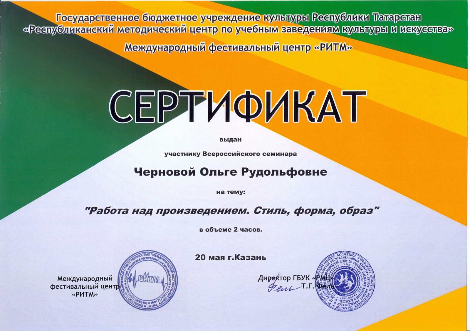 Всероссийский семинар в рамках проведения Международных фестивалей "Ритм" - выступление Черновой О.Р. по теме "Работа над произведением. Стиль, форма, образ" - сертификат