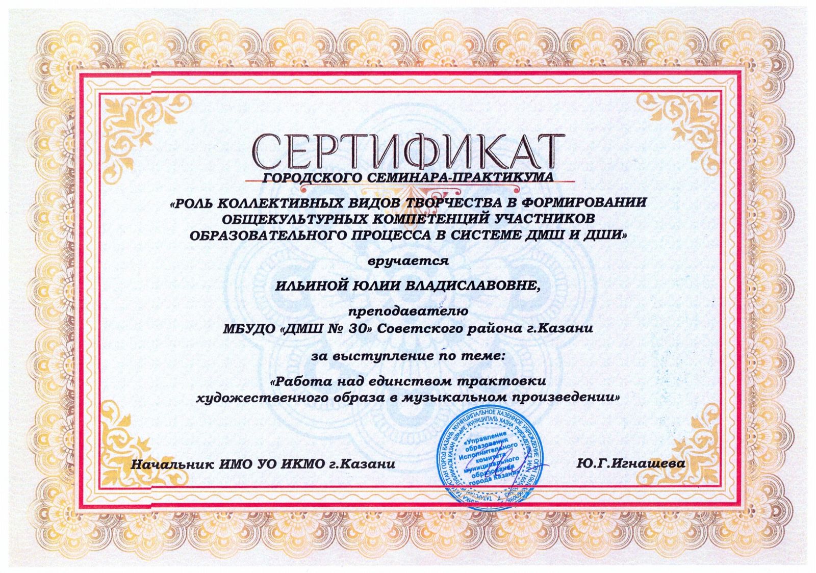 Городской семинар-практикум руководящих и педагогических работников учреждений дополнительного образования г.Казани "Роль коллективных видов творчества в фрмировании общекультурных компетенций участиников образовательного процесса в системе ДМШ и ДШИ" - выступление Ильиной Ю.В. по теме "Работа над единством трактовки художественного образа в музыкальном произведении"