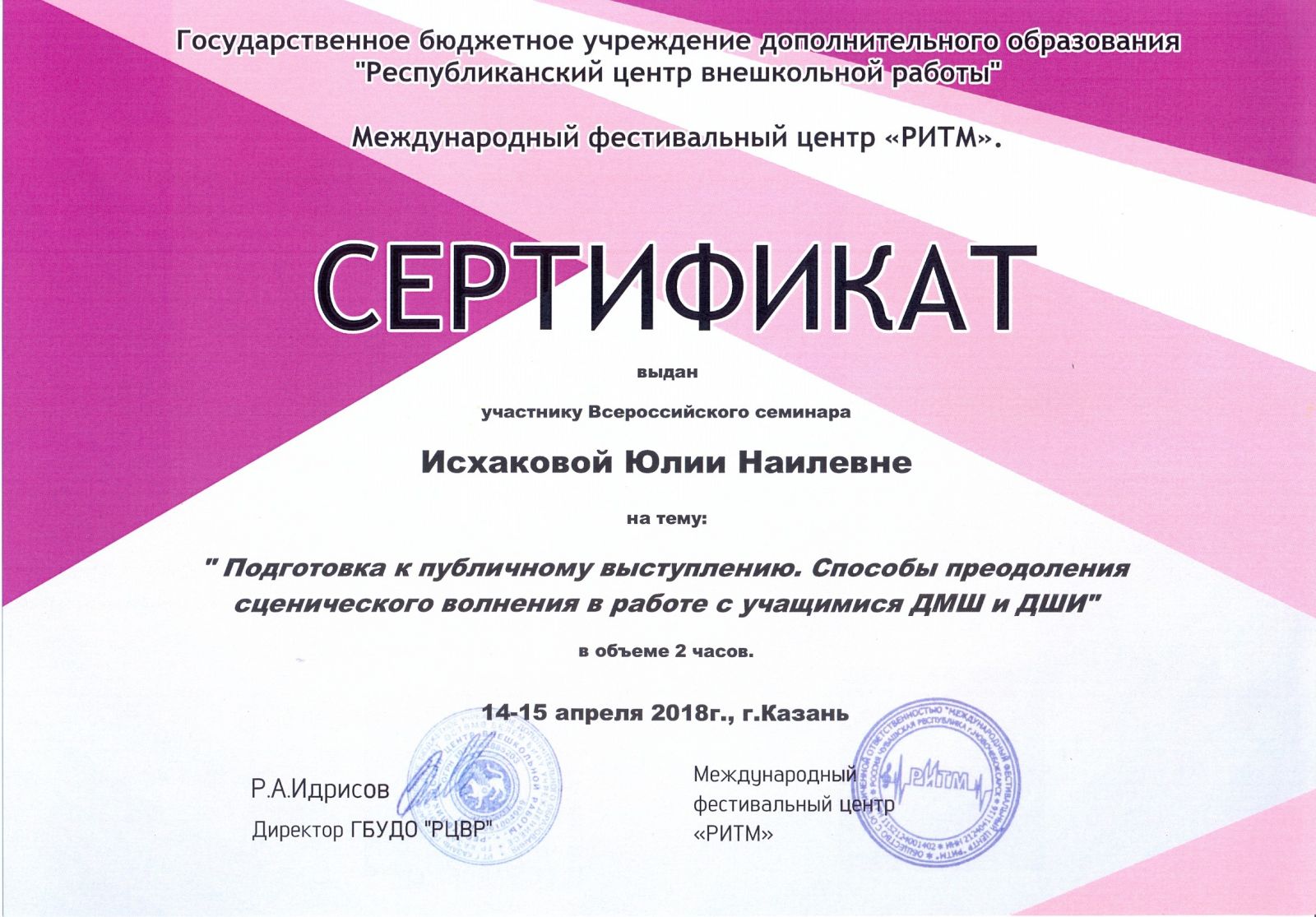 Всероссийский семинар в рамках фестиваля-конкурса "Ритмы весны" на тему "Подготовка к публичному выступлению. Способы преодоления сценического волнения в работе с учащимися ДМШ и ДШИ" - Исхакова Ю.Н. - сертификат участника