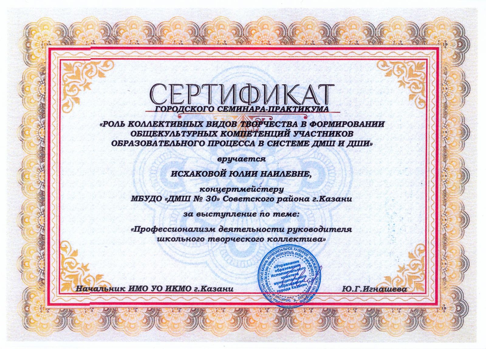 Городской семинар-практикум руководящих и педагогических работников учреждений дополнительного образования г.Казани "Роль коллективных видов творчества в фрмировании общекультурных компетенций участиников образовательного процесса в системе ДМШ и ДШИ" - выступление Исхаковой Ю.Н. по теме "Профессионализм деятельности руководителя школьного творческого коллектива"