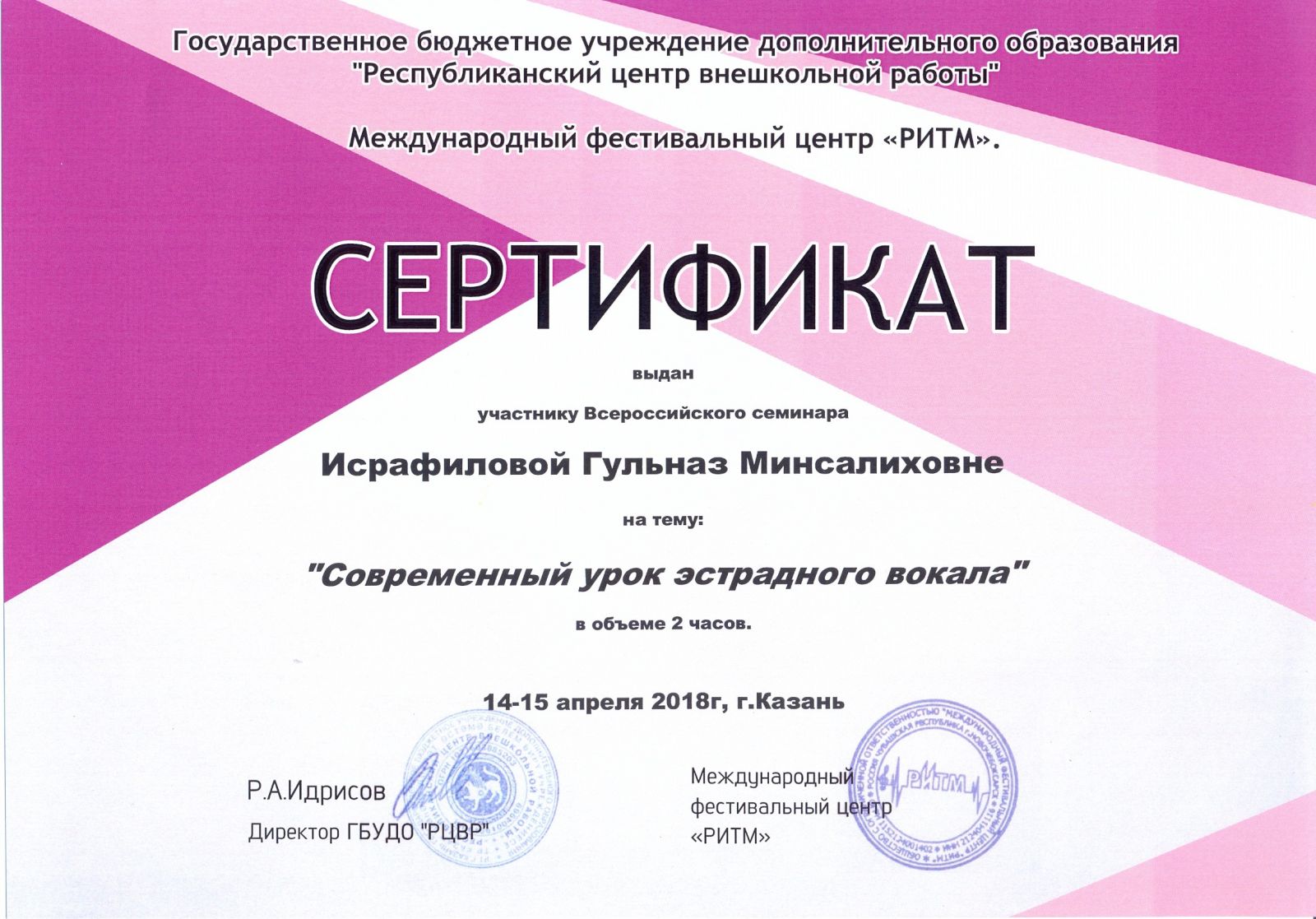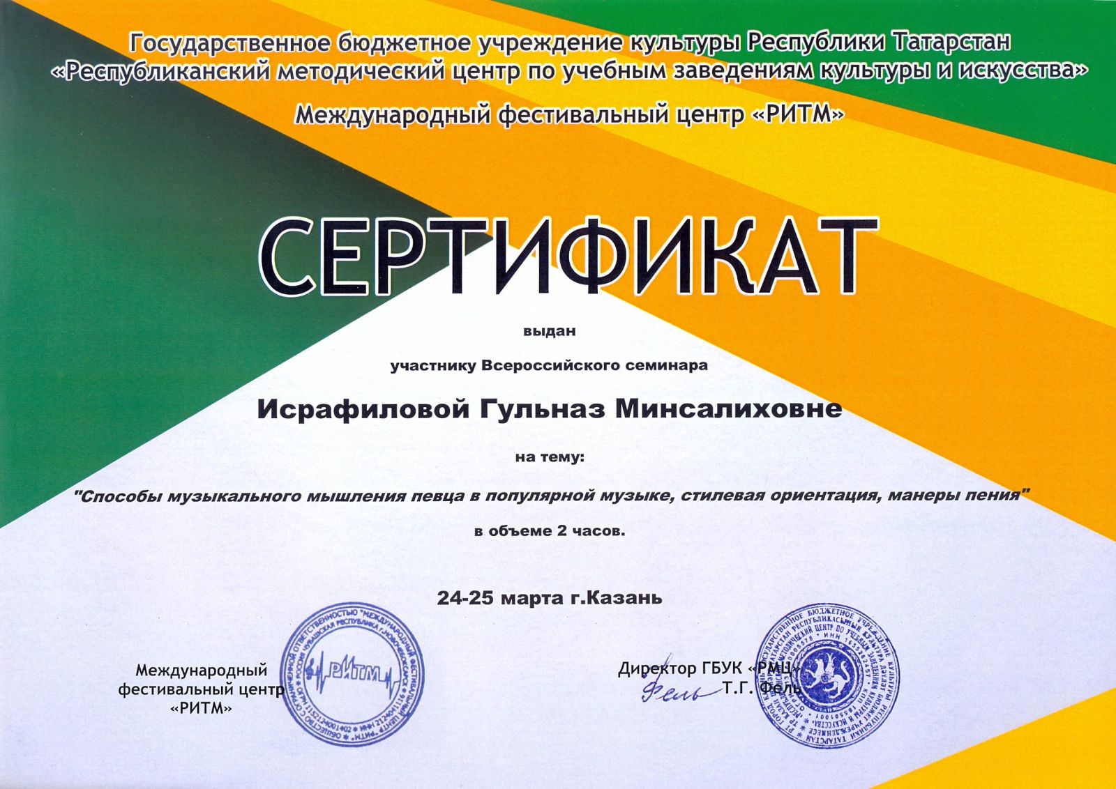 Всероссийский семинар "Способы музыкального мышления певца в популярной музыке, стилевая ориентация, манеры пения" в рамках проведения международных фестивалей "Ритм" - Исрафилова Г.М. - сертификат участника