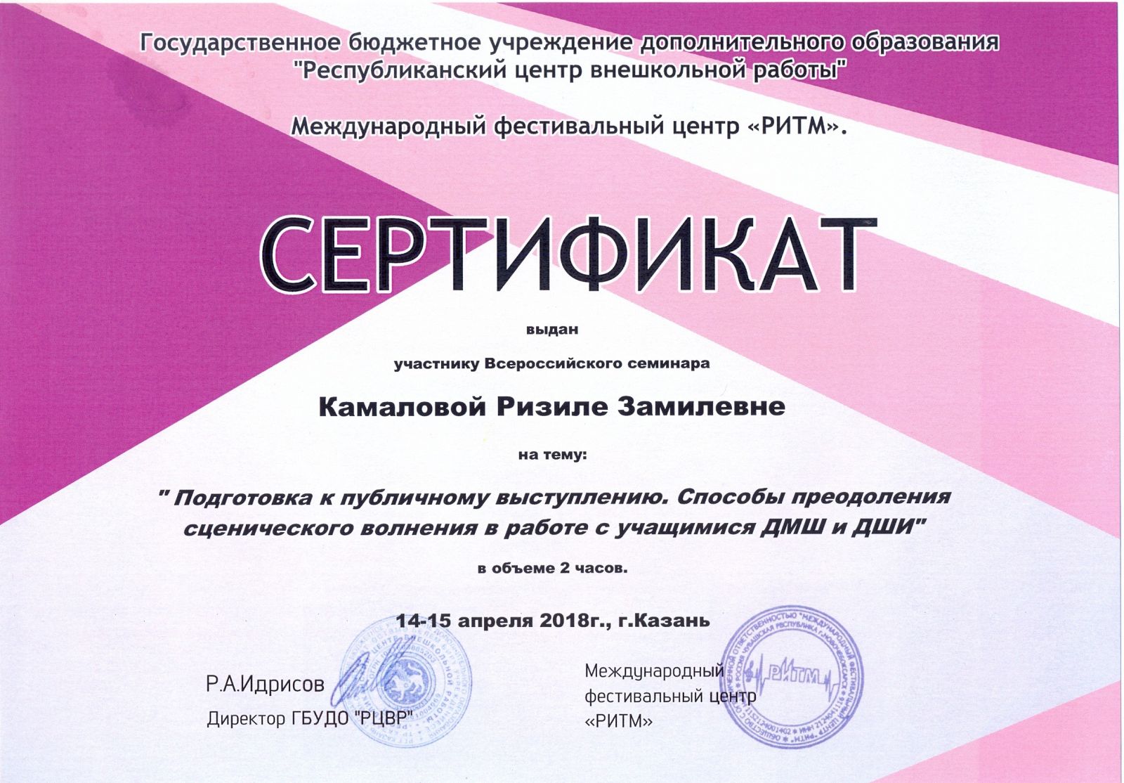 Всероссийский семинар в рамках фестиваля-конкурса "Ритмы весны" на тему "Подготовка к публичному выступлению. Способы преодоления сценического волнения в работе с учащимися ДМШ и ДШИ" - Камалова Р.З. - сертификат участника