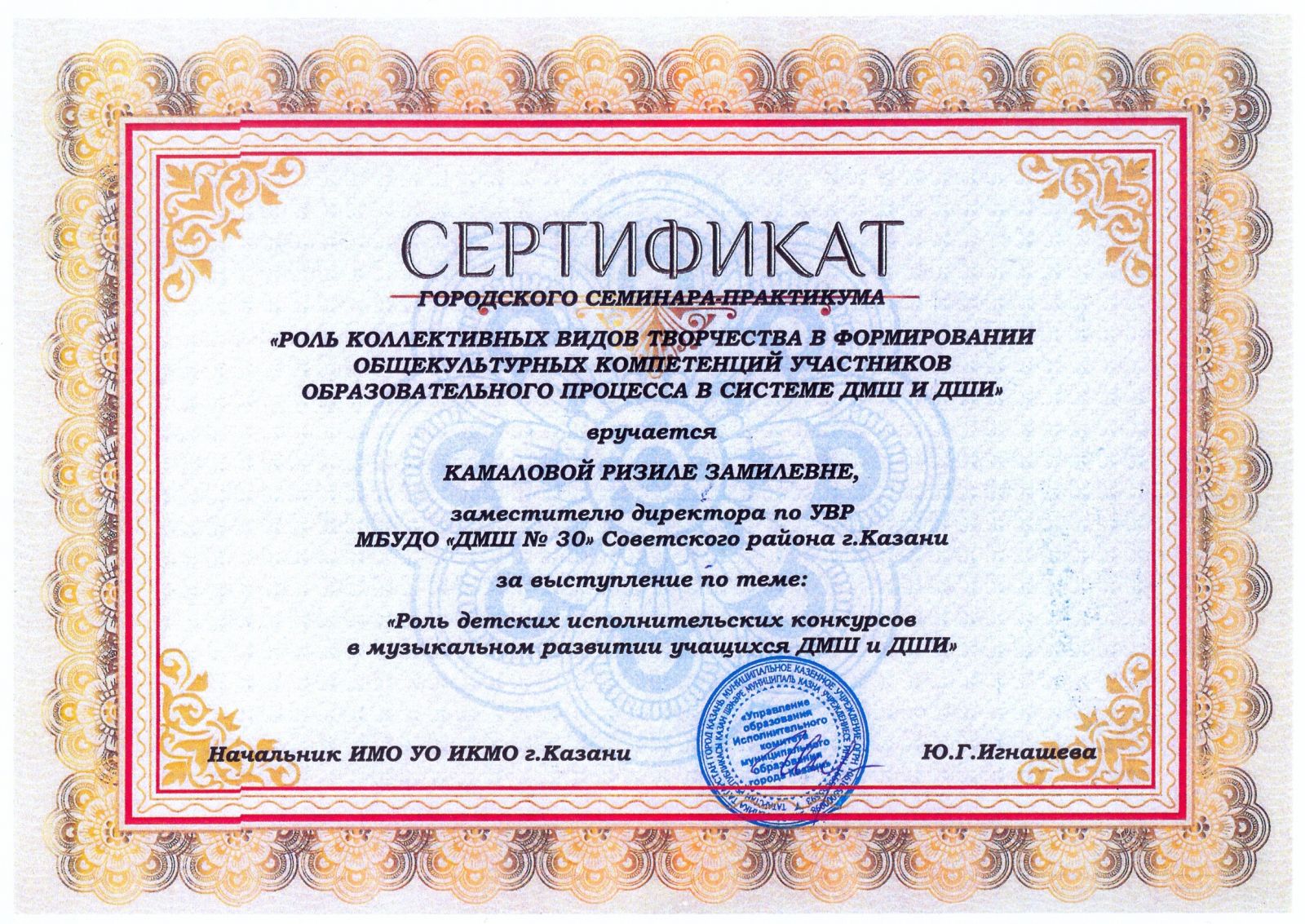 Городской семинар-практикум руководящих и педагогических работников учреждений дополнительного образования г.Казани "Роль коллективных видов творчества в фрмировании общекультурных компетенций участиников образовательного процесса в системе ДМШ и ДШИ" - выступление Камаловой Р.З. по теме "Роль детских исполнительских конкурсов в музыкальном развитии учащихся ДМШ и ДШИ"