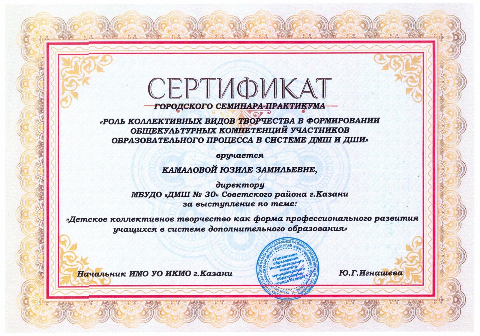 Городской семинар-практикум руководящих и педагогических работников учреждений дополнительного образования г.Казани "Роль коллективных видов творчества в фрмировании общекультурных компетенций участиников образовательного процесса в системе ДМШ и ДШИ" - выступление Камаловой Ю.З. по теме "Детское коллективное творчество как форма профессионального развития учащихся в системе дополнительного образования"