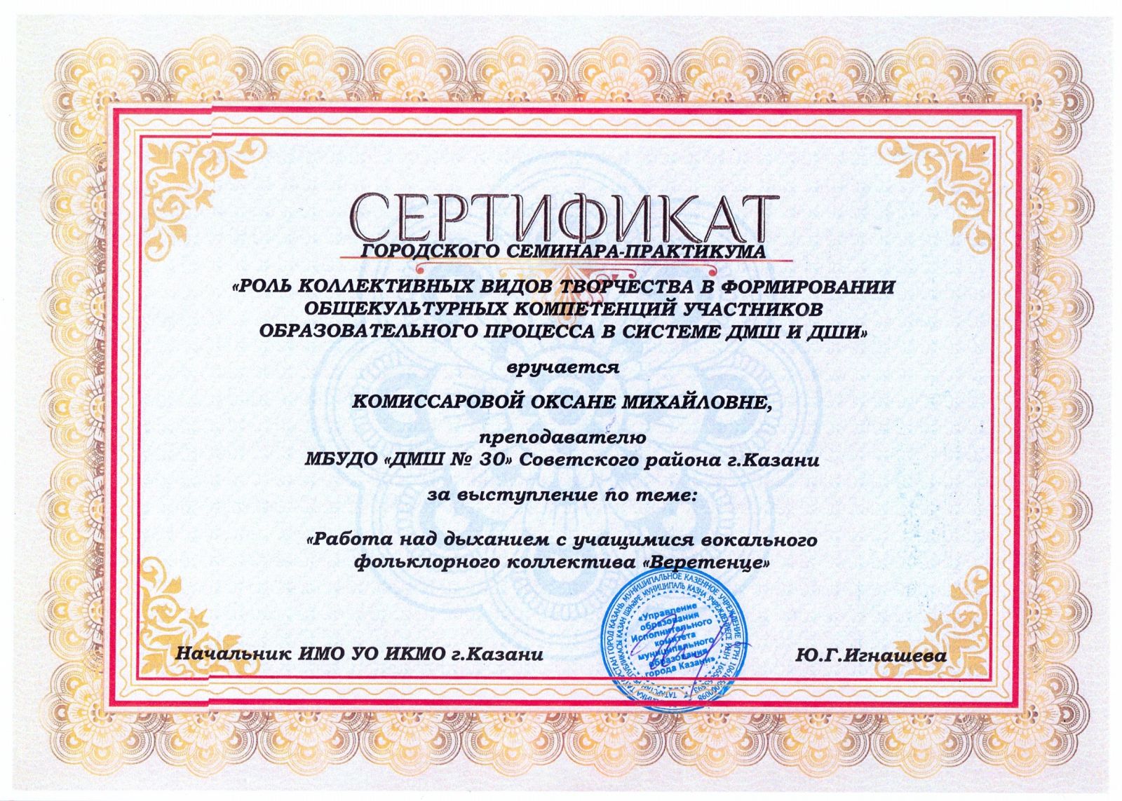 Городской семинар-практикум руководящих и педагогических работников учреждений дополнительного образования г.Казани "Роль коллективных видов творчества в фрмировании общекультурных компетенций участиников образовательного процесса в системе ДМШ и ДШИ" - выступление Комиссаровой О.М. по теме "Работа над дыханием с учащимися вокального фольклорного коллектива "Веретенце"