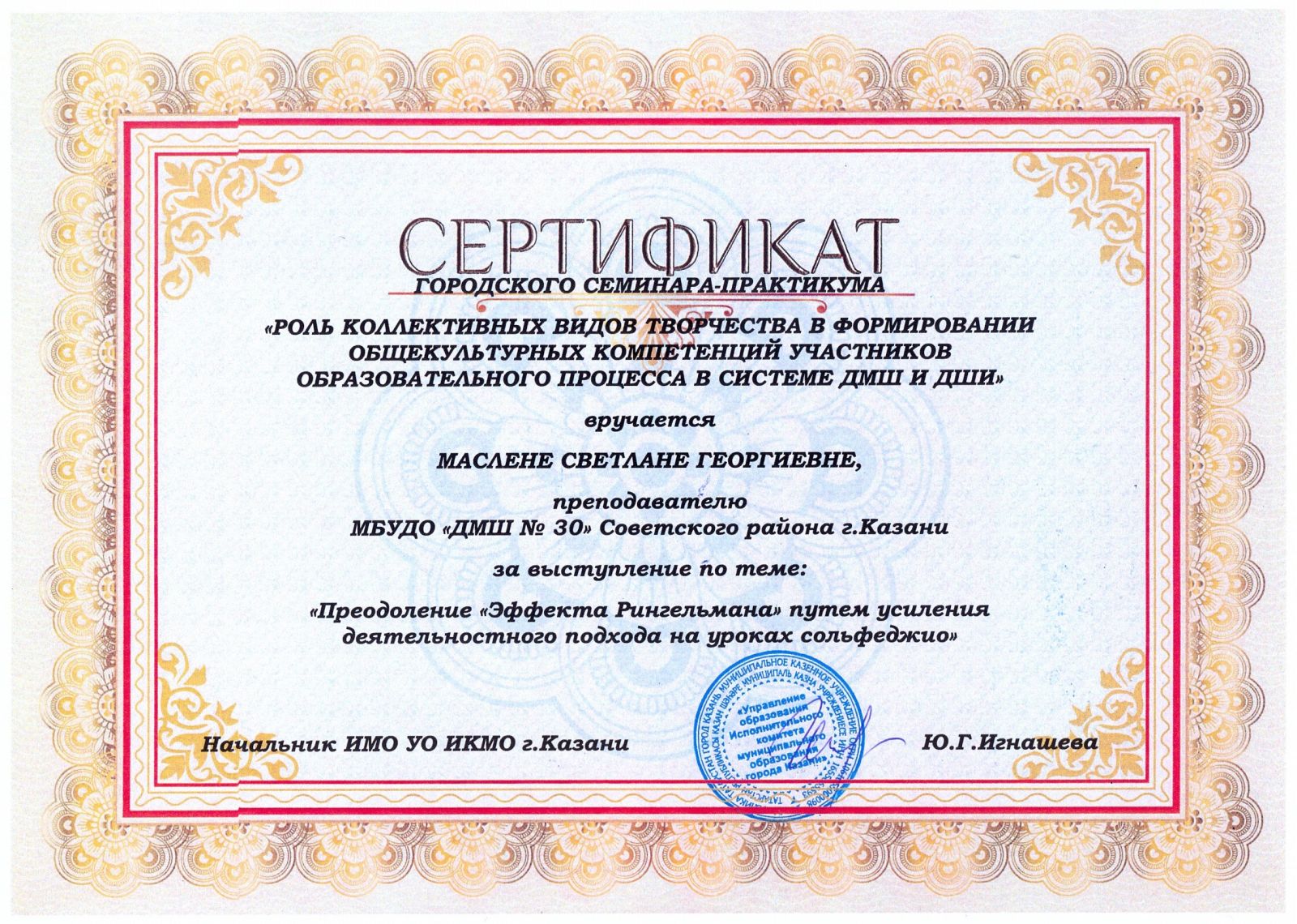 Городской семинар-практикум руководящих и педагогических работников учреждений дополнительного образования г.Казани "Роль коллективных видов творчества в фрмировании общекультурных компетенций участиников образовательного процесса в системе ДМШ и ДШИ" - выступление Маслены С.Г. по теме "Преодоление "Эффекта Рингельмана" путем усиления деятельностного подхода на уроках сольфеджио"