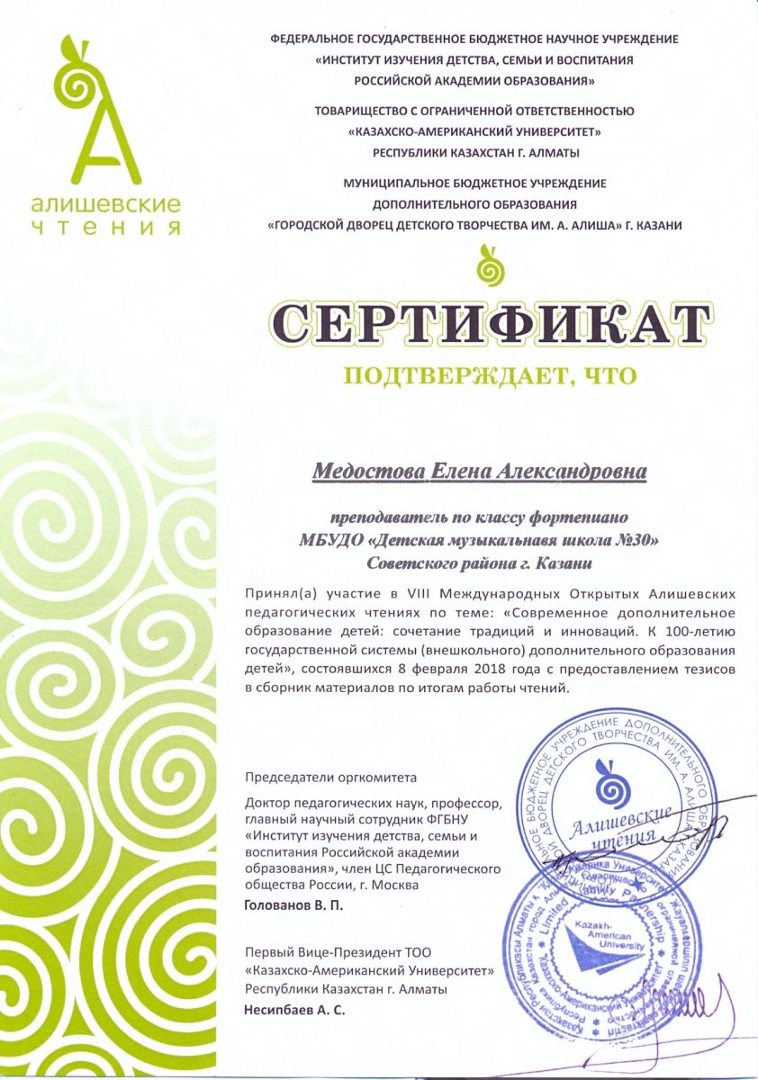 VIII Международные Открытые Алишевские педагогические чтения "Современное дополнительное образование детей: сочетание традиций и инноваций" - Медостова Е.А. (с публикацией тезисов выступления)