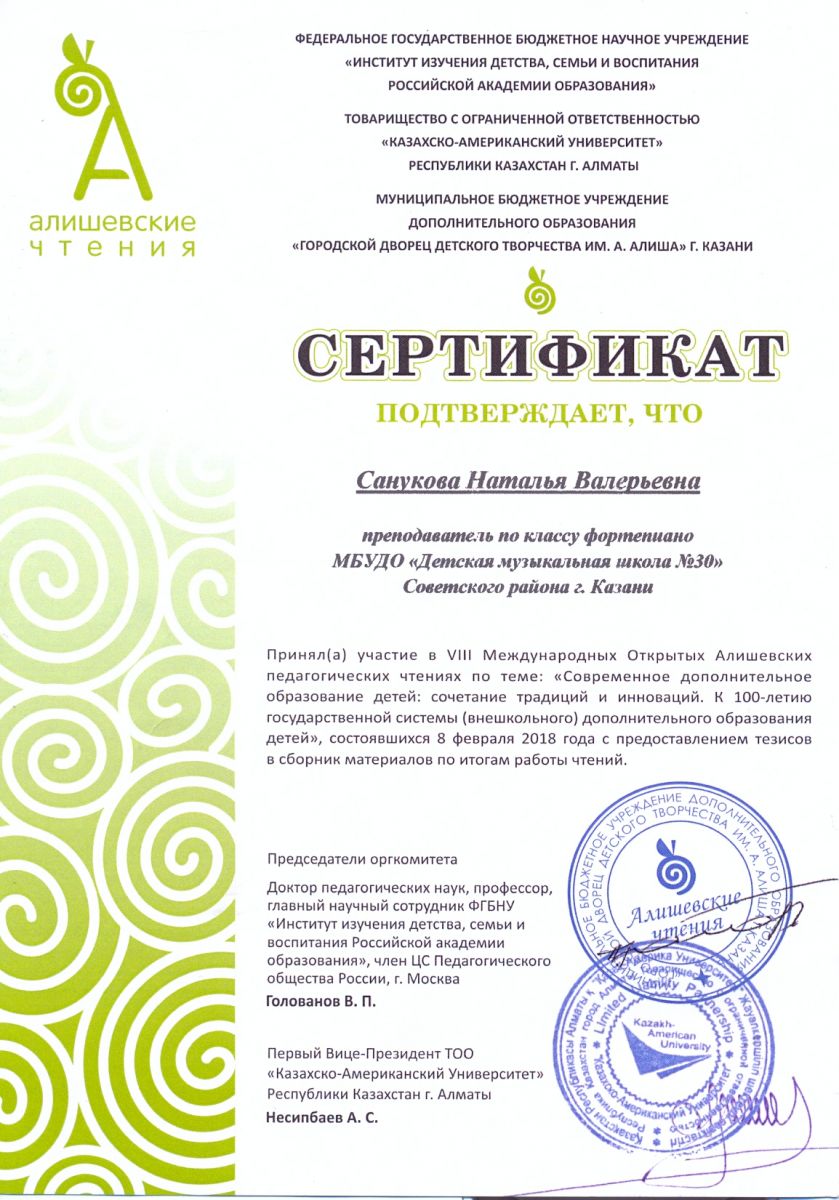 VIII Международные Открытые Алишевские педагогические чтения "Современное дополнительное образование детей: сочетание традиций и инноваций" - Санукова Н.В. (с публикацией тезисов выступления)