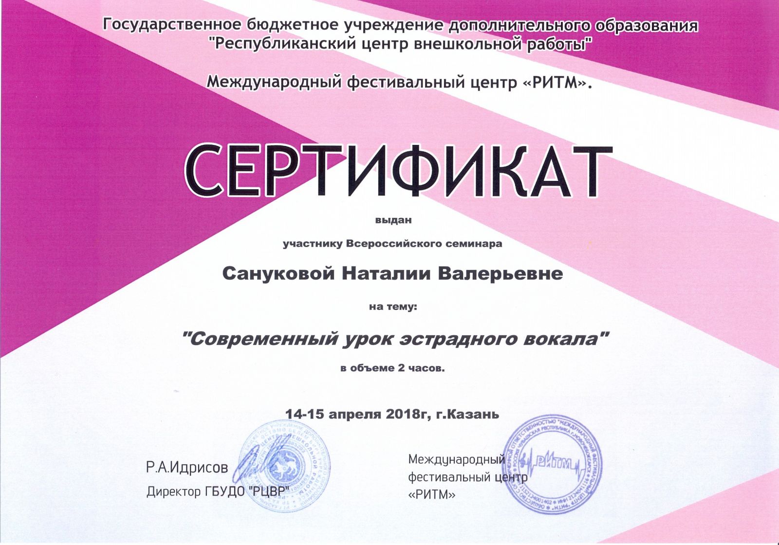 Всероссийский семинар в рамках фестиваля-конкурса "Ритмы весны" на тему "Подготовка к публичному выступлению. Способы преодоления сценического волнения в работе с учащимися ДМШ и ДШИ" - Санукова Н.В. - сертификат участника