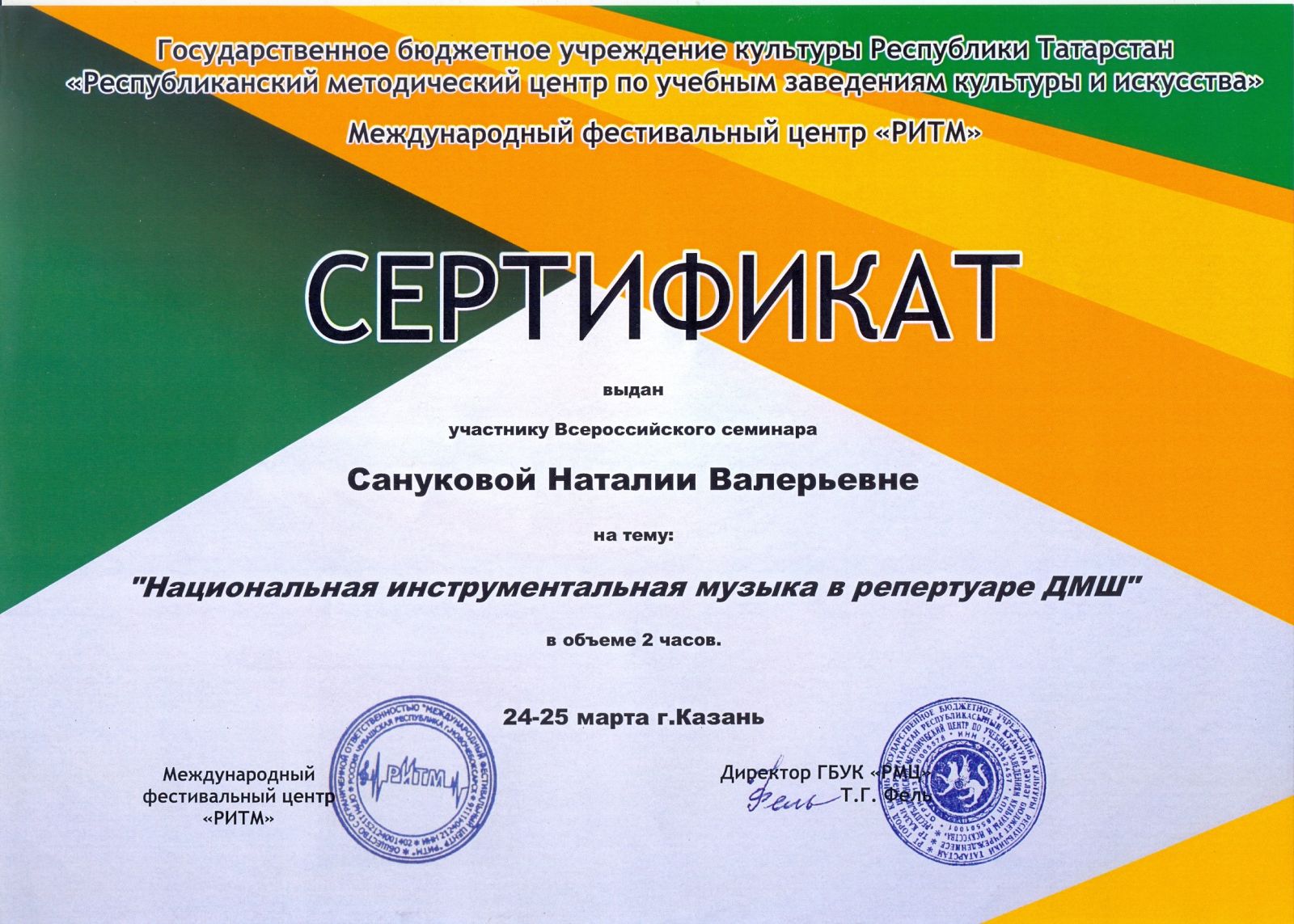 Всероссийский семинар "Национальная инструменнтальная музыка в репертуаре ДМШ" в рамках проведения международных фестивалей "Ритм" - Санукова Н.В. - сертификат участника