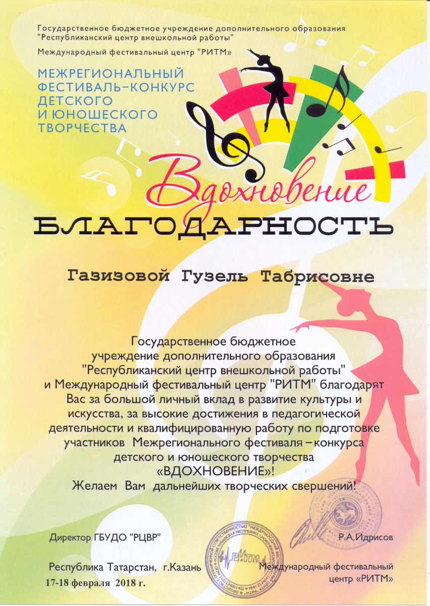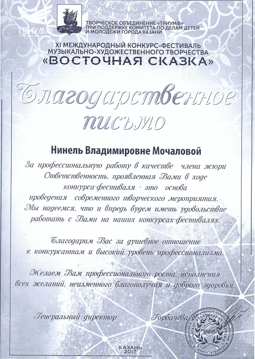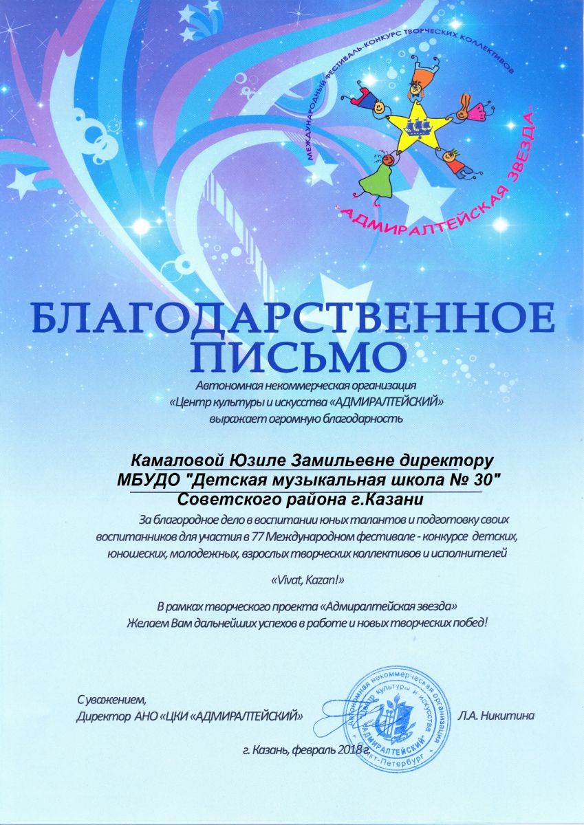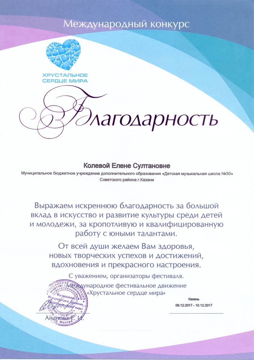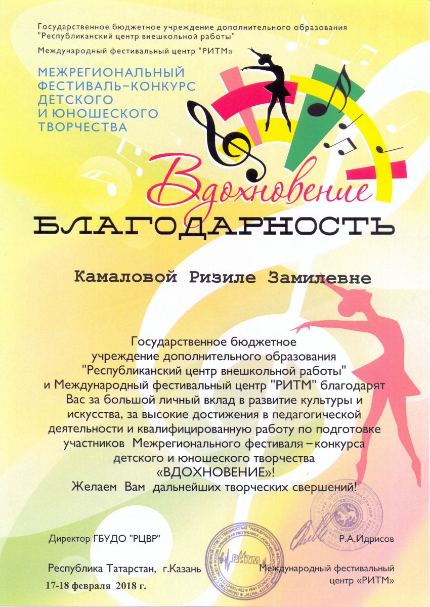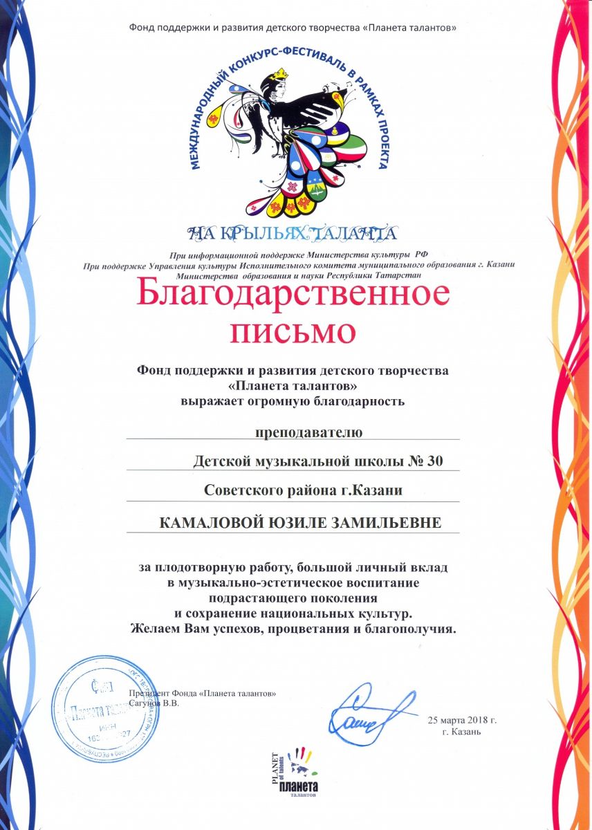 Международный конкурс-фестиваль "На крыльях таланта" - Камалова Ю.З. - благодарность