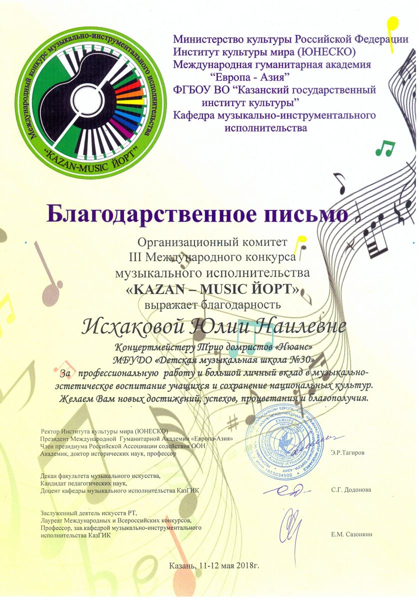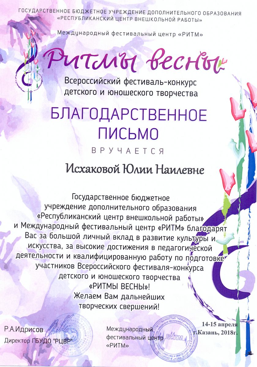Международный конкурс-фестиваль "На крыльях таланта" - Исхакова Ю.Н. - благодарность