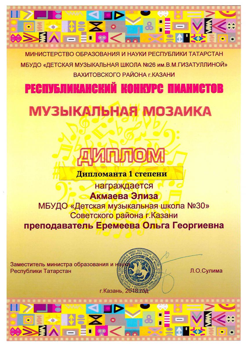 Республиканский конкурс пианистов "Музыкальная мозаика" - Акмаева Элиза - диплом I степени